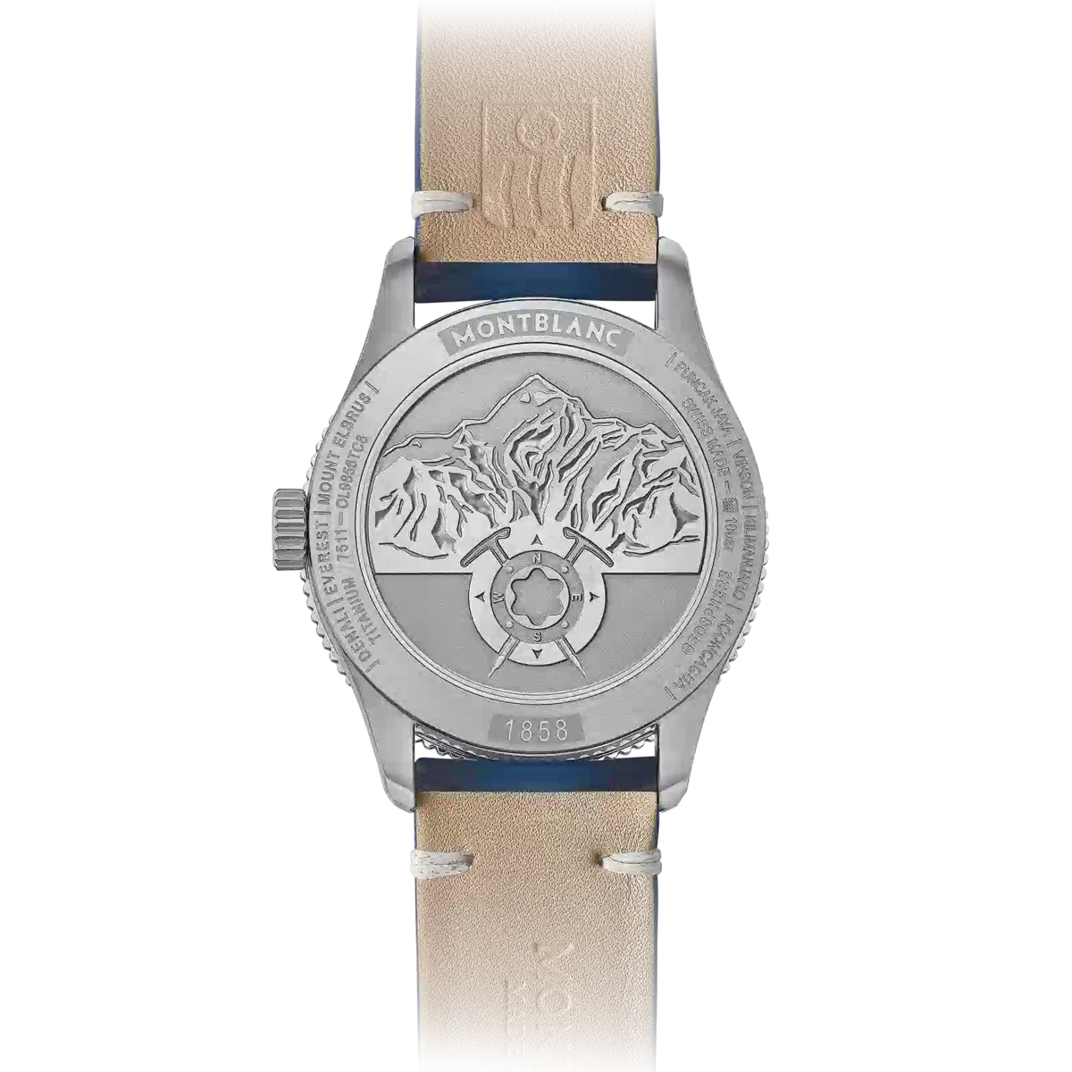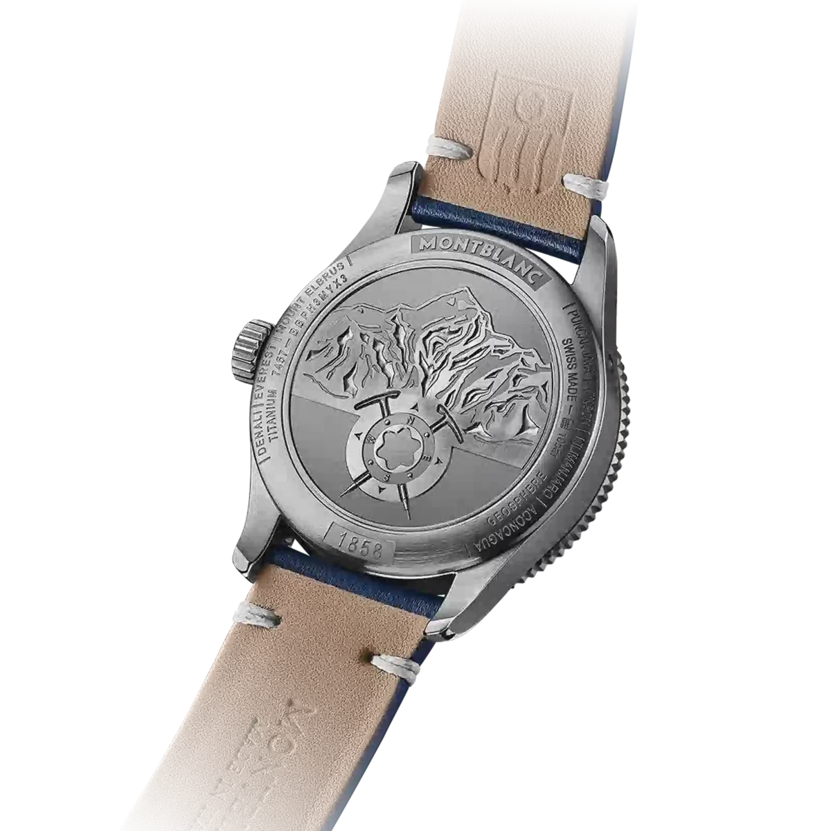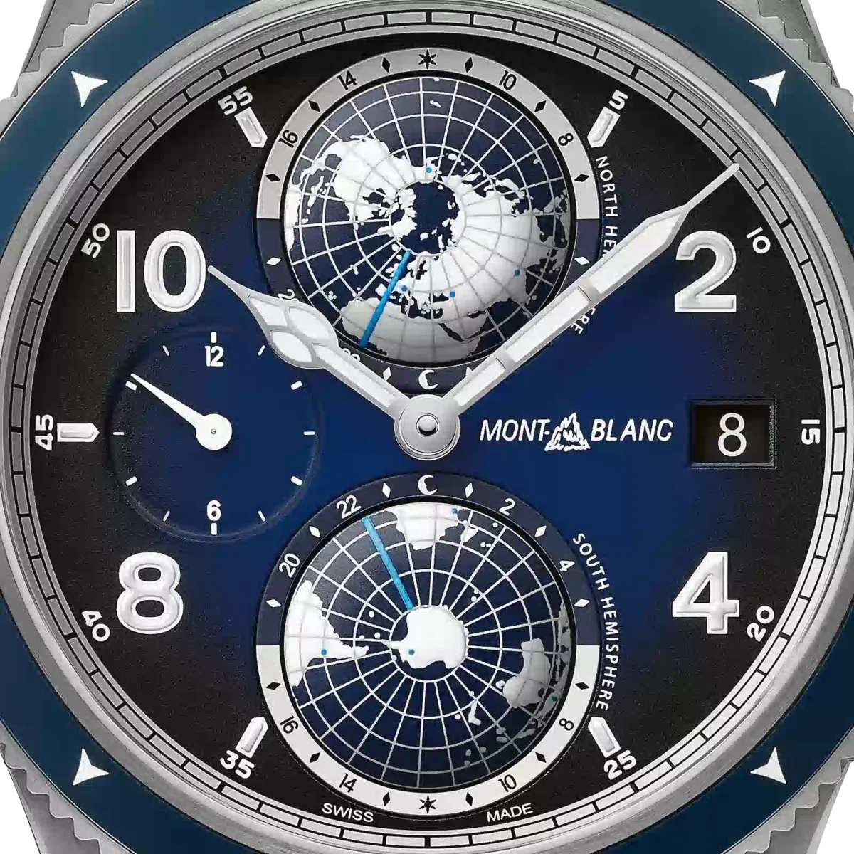 La linea di prodotti Montblanc 1858 si ispira agli orologi professionali Minerva degli anni ’20 e ’30, concepiti per uso militare e per l’esplorazione. Reinterpretando questi leggendari segnatempo, la linea di prodotti Montblanc 1858 esprime lo spirito dell’esplorazione montana, incarnando la tendenza moderna del ritorno alla natura. Il Montblanc 1858 Geosphere è dedicato alla sfida alpinistica delle Sette Cime, il Santo Graal delle avventure alpinistiche. È disponibile con cassa in titanio da 42 mm abbinata a dettagli blu e bianco ghiaccio a contrasto, che traggono ispirazione dai colori dei ghiacciai. L’orologio è dotato di una complicazione worldtime sviluppata dagli orologiai Montblanc a Villeret: due globi bombati che ruotano in direzioni opposte, completando una rotazione completa in 24 ore. Entrambi sono circondati da una scala con i 24 fusi orari, insieme a un’indicazione del giorno e della notte in colori contrastanti. Ciò consente di apprezzare in modo intuitivo i diversi fusi orari, grazie anche al SuperLumiNova® applicato ai continenti per una maggiore visibilità e prestazioni notturne. L’orologio è rifinito con un cinturino in pelle di vitello sfumato blu con cuciture bianche.