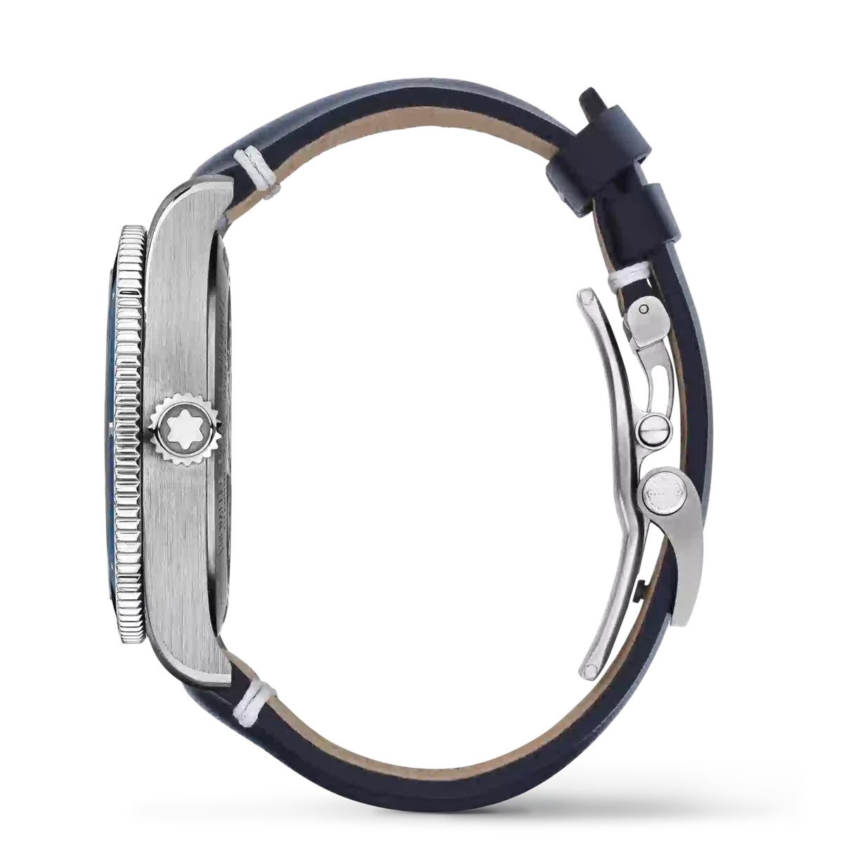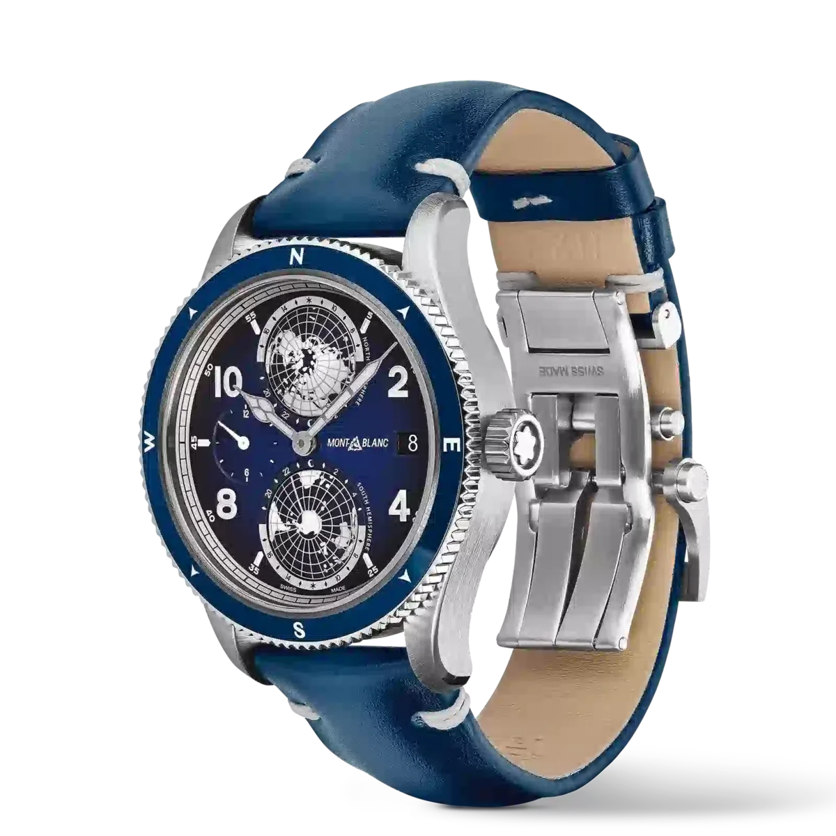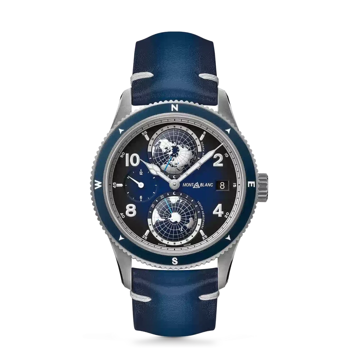 La linea di prodotti Montblanc 1858 si ispira agli orologi professionali Minerva degli anni ’20 e ’30, concepiti per uso militare e per l’esplorazione. Reinterpretando questi leggendari segnatempo, la linea di prodotti Montblanc 1858 esprime lo spirito dell’esplorazione montana, incarnando la tendenza moderna del ritorno alla natura. Il Montblanc 1858 Geosphere è dedicato alla sfida alpinistica delle Sette Cime, il Santo Graal delle avventure alpinistiche. È disponibile con cassa in titanio da 42 mm abbinata a dettagli blu e bianco ghiaccio a contrasto, che traggono ispirazione dai colori dei ghiacciai. L’orologio è dotato di una complicazione worldtime sviluppata dagli orologiai Montblanc a Villeret: due globi bombati che ruotano in direzioni opposte, completando una rotazione completa in 24 ore. Entrambi sono circondati da una scala con i 24 fusi orari, insieme a un’indicazione del giorno e della notte in colori contrastanti. Ciò consente di apprezzare in modo intuitivo i diversi fusi orari, grazie anche al SuperLumiNova® applicato ai continenti per una maggiore visibilità e prestazioni notturne. L’orologio è rifinito con un cinturino in pelle di vitello sfumato blu con cuciture bianche.