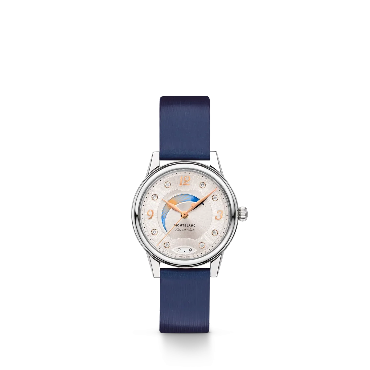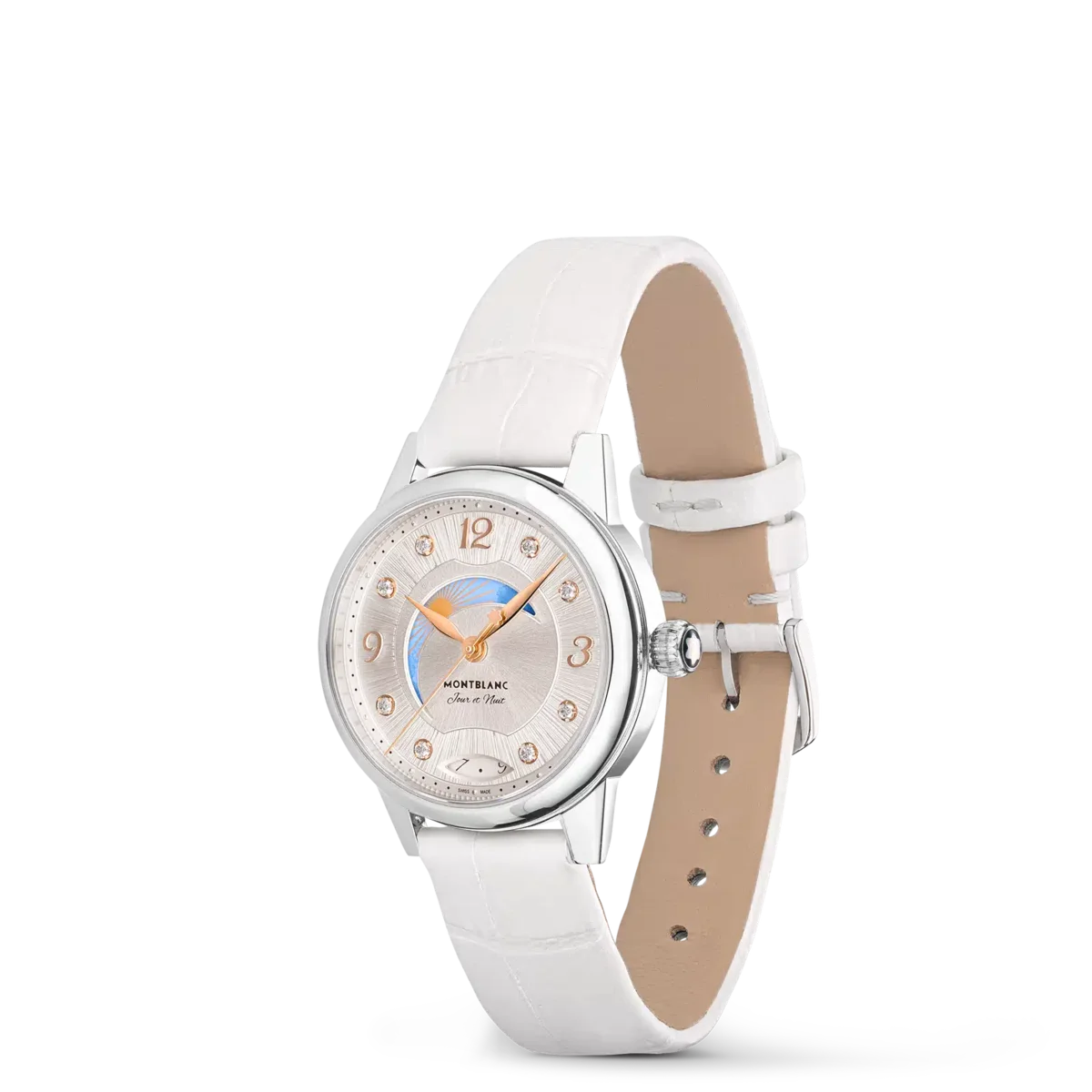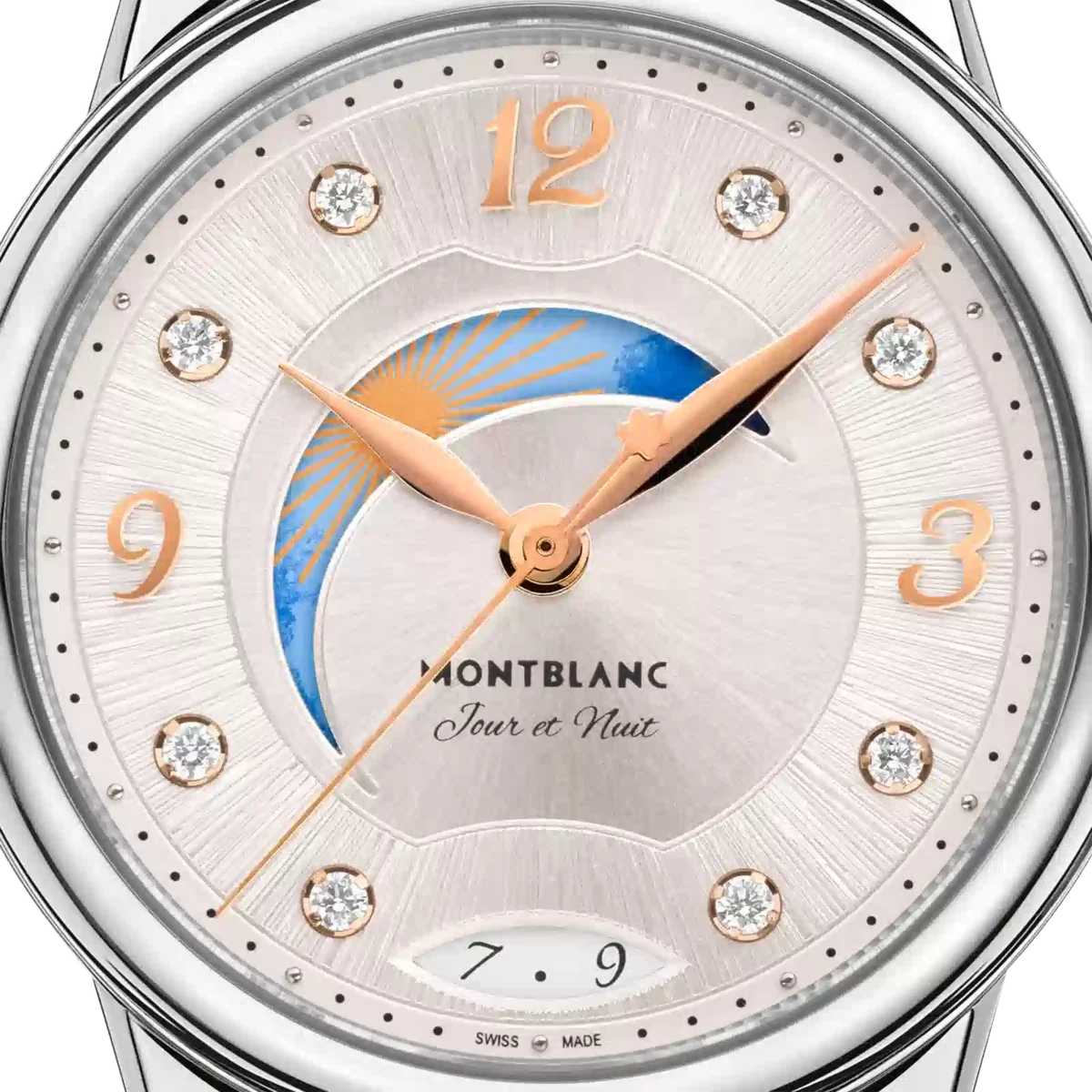 Interpretando i codici dell’alta orologeria in modo elegante e femminile, il Montblanc Bohème Day & Night si ispira al mondo della scrittura a mano e degli acquerelli ed è disponibile con cassa in acciaio inossidabile da 30 mm. Presenta un elegante quadrante bianco-argento spazzolato sole adornato con indici diamantati, numeri arabi floreali rivestiti in oro rosa e lancette. Altri dettagli raffinati includono un motivo filet sauté e una tecnica di stampaggio chiamata filé d’étoiles. Dotato del calibro automatico MB 24.20, questo modello indica le ore, i minuti e i secondi, oltre alla data visualizzata in un’apertura a forma di mandorla con numeri scritti a mano. Il romantico carattere tipografico è stato applicato anche al quadrante per l’indicazione del giorno e della notte “Jour et Nuit”. La complicazione celeste giorno e notte mostra il cielo che cambia nell’arco di 24 ore e conferisce un tocco romantico e artistico all’orologio, poiché è realizzata con acquerelli. Questo orologio è dotato di un cinturino intercambiabile in pelle di vitello bianca con stampa alligatore e di un cinturino aggiuntivo.