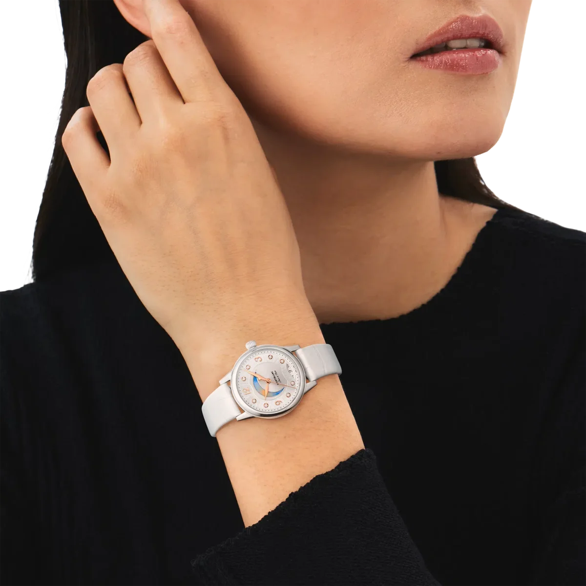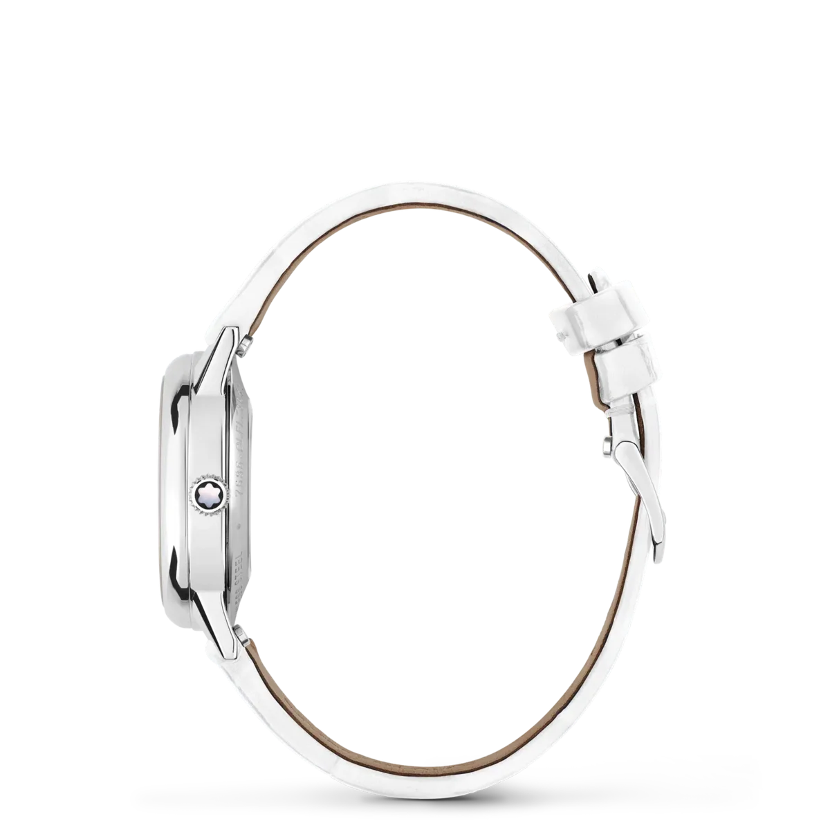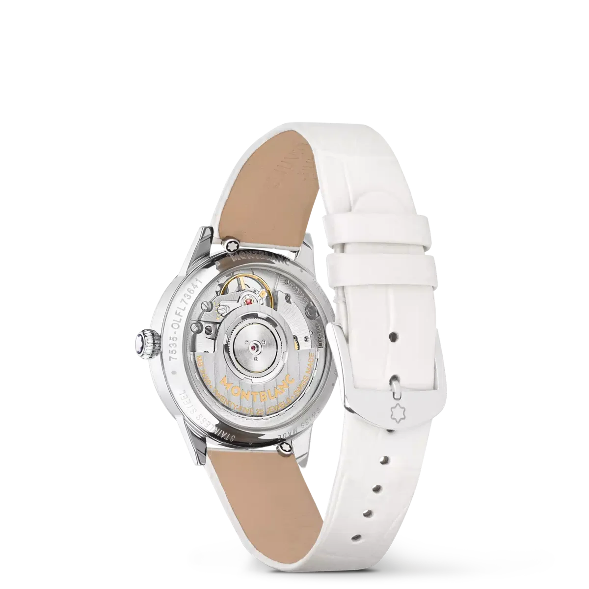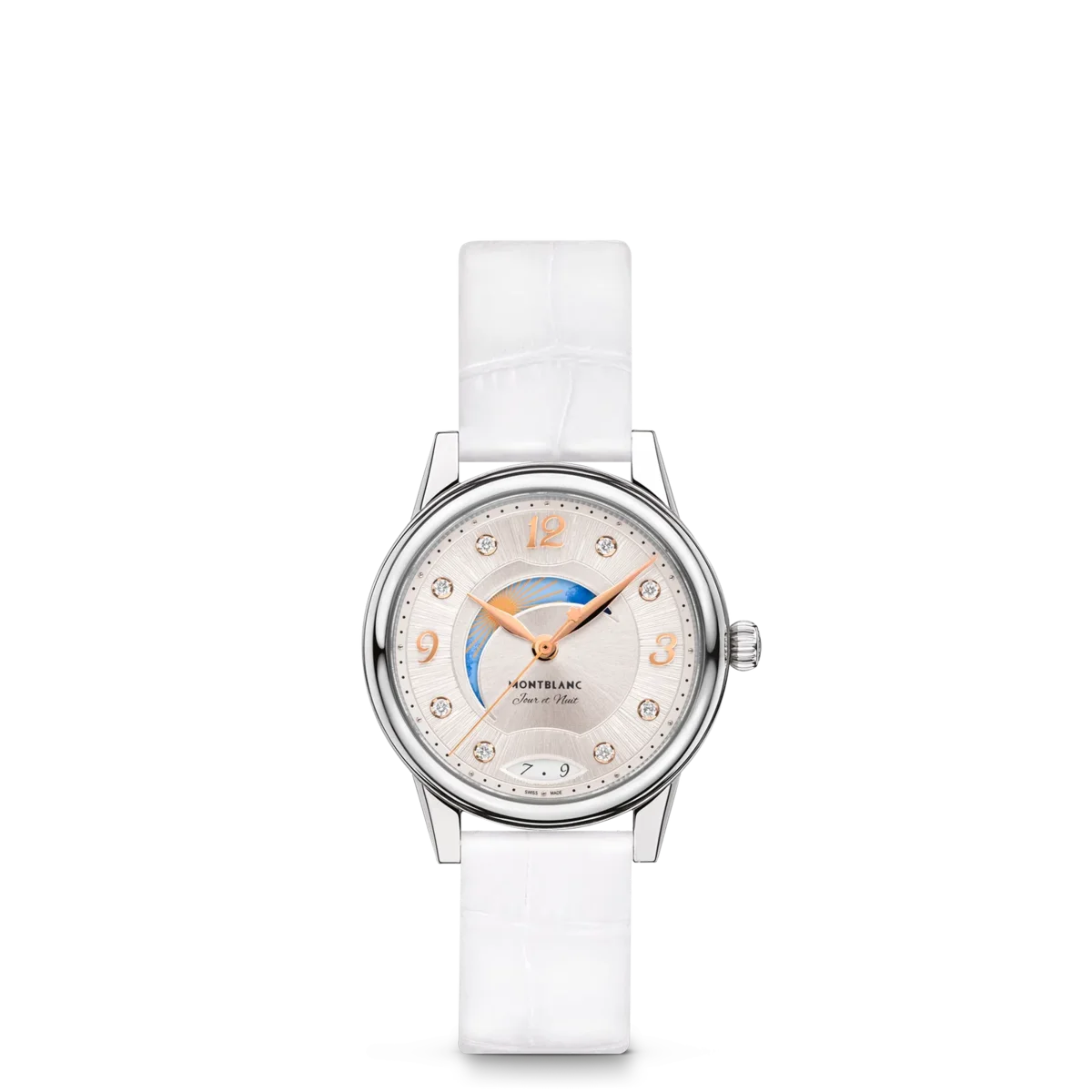 Interpretando i codici dell’alta orologeria in modo elegante e femminile, il Montblanc Bohème Day & Night si ispira al mondo della scrittura a mano e degli acquerelli ed è disponibile con cassa in acciaio inossidabile da 30 mm. Presenta un elegante quadrante bianco-argento spazzolato sole adornato con indici diamantati, numeri arabi floreali rivestiti in oro rosa e lancette. Altri dettagli raffinati includono un motivo filet sauté e una tecnica di stampaggio chiamata filé d’étoiles. Dotato del calibro automatico MB 24.20, questo modello indica le ore, i minuti e i secondi, oltre alla data visualizzata in un’apertura a forma di mandorla con numeri scritti a mano. Il romantico carattere tipografico è stato applicato anche al quadrante per l’indicazione del giorno e della notte “Jour et Nuit”. La complicazione celeste giorno e notte mostra il cielo che cambia nell’arco di 24 ore e conferisce un tocco romantico e artistico all’orologio, poiché è realizzata con acquerelli. Questo orologio è dotato di un cinturino intercambiabile in pelle di vitello bianca con stampa alligatore e di un cinturino aggiuntivo.