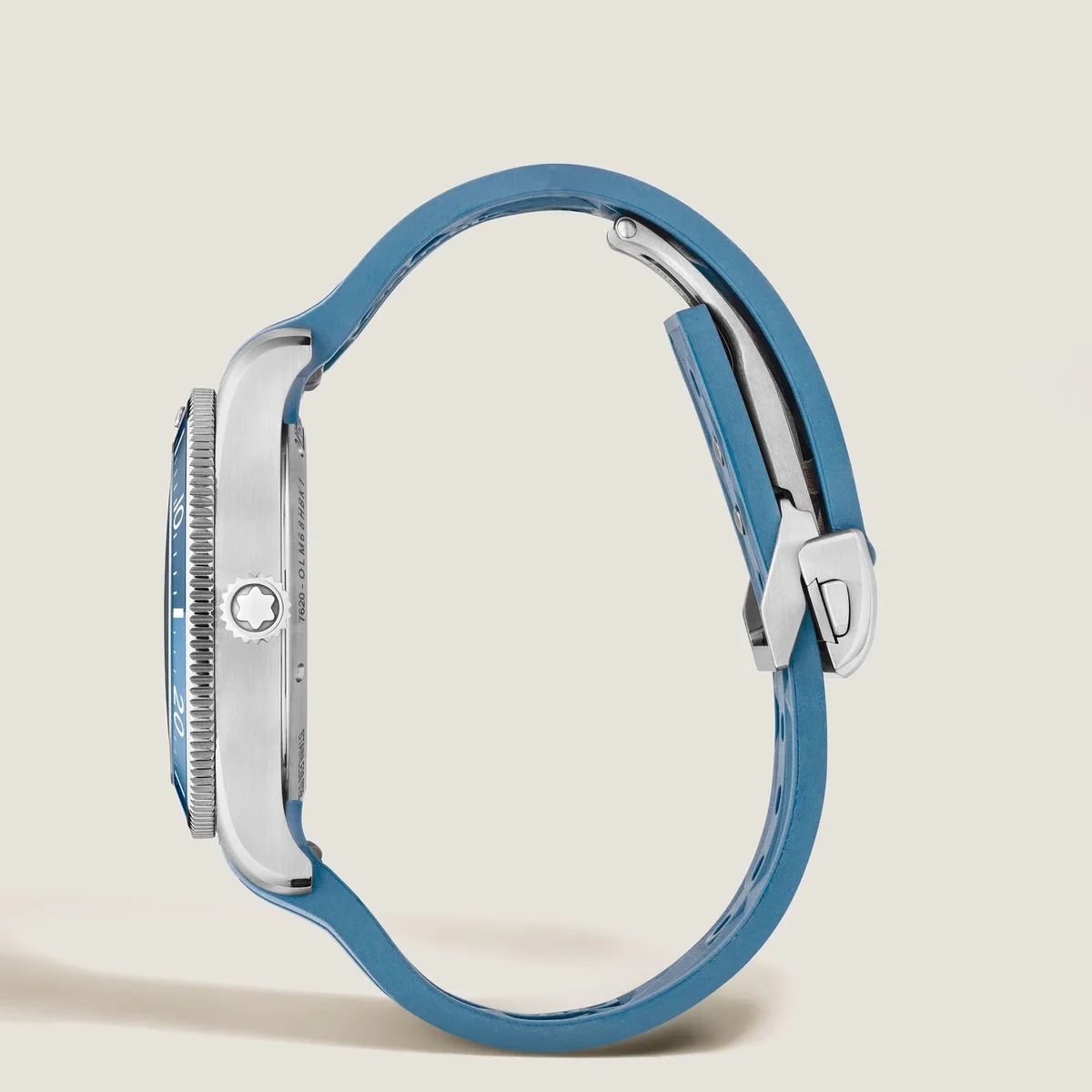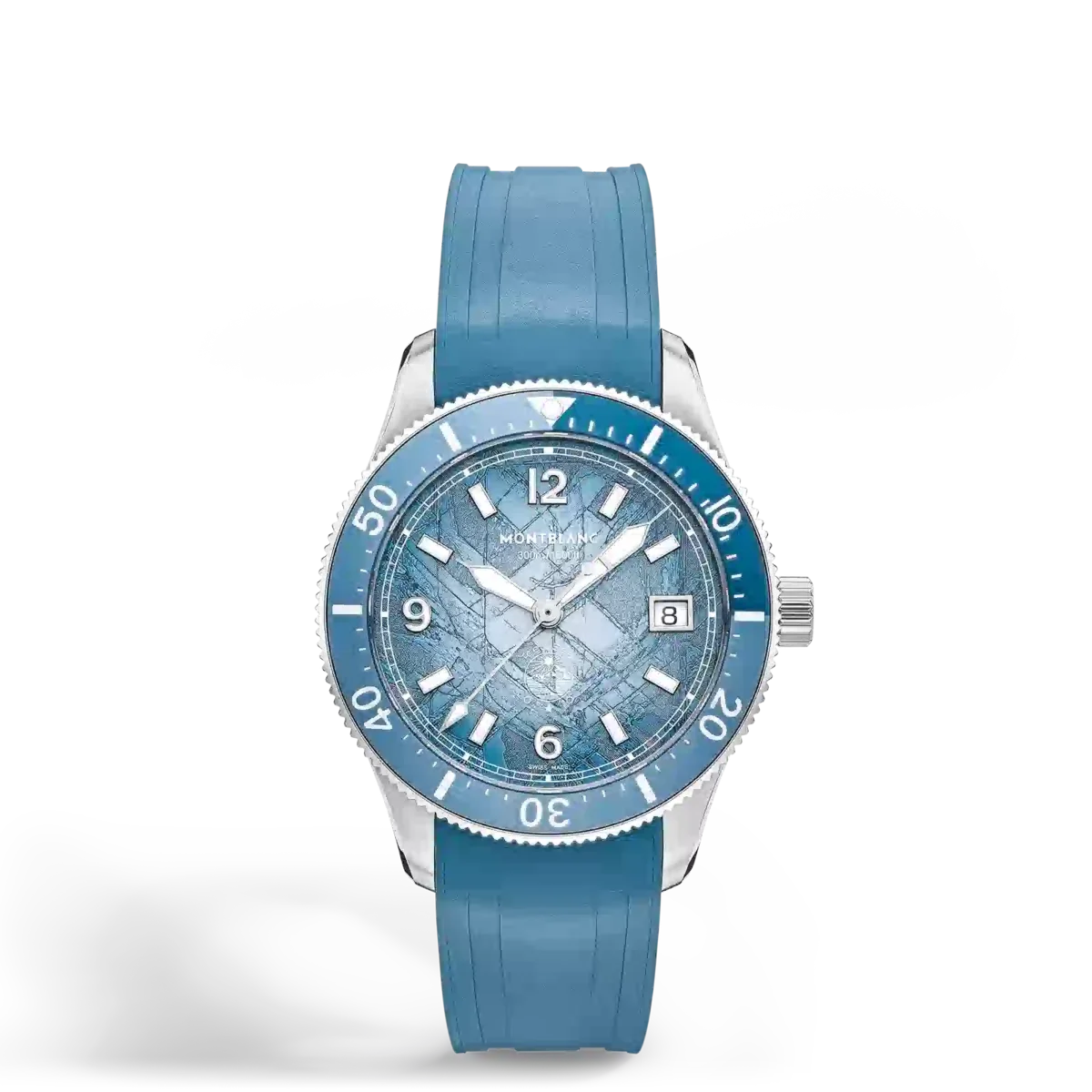 Il Montblanc Iced Sea Automatic Date 0 Oxygen con quadrante blu sfumato con motivo ghiacciaio dà l’impressione di guardare nelle profondità di un ghiacciaio. Ispirata alla Mer de Glace, questa texture glaciale è stata ottenuta utilizzando una tecnica ancestrale quasi dimenticata chiamata gratté-boisé. L’orologio è racchiuso in una cassa in acciaio inossidabile da 38 mm totalmente priva di ossigeno ed è dotato di una lunetta girevole unidirezionale con inserto in alluminio anodizzato blu bicolore, un’incisione 3D sul fondello e un cinturino intercambiabile in caucciù blu con sistema di regolazione fine. L’orologio è conforme alla norma ISO 6425 per le immersioni subacquee e ha un’impermeabilità di 300 metri.