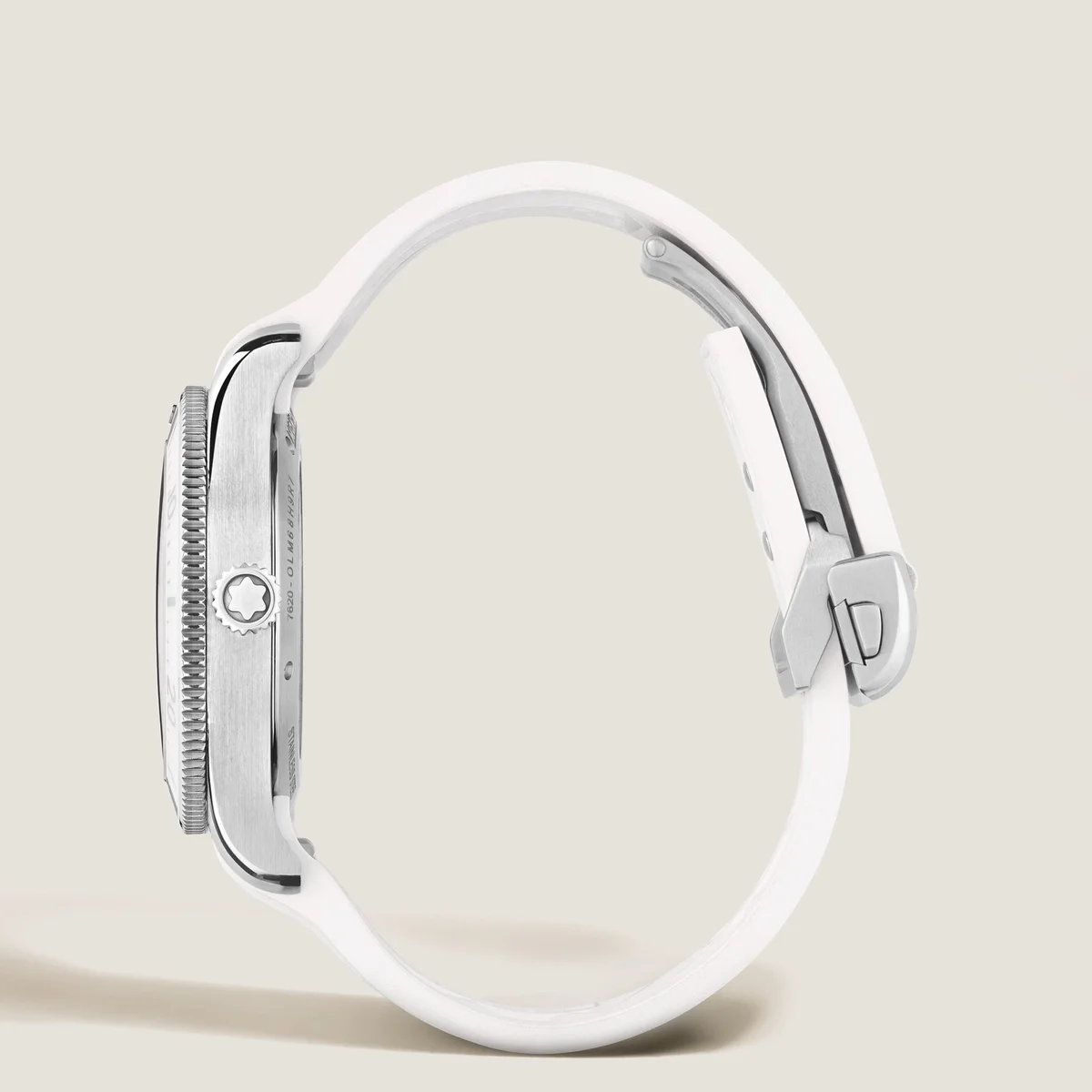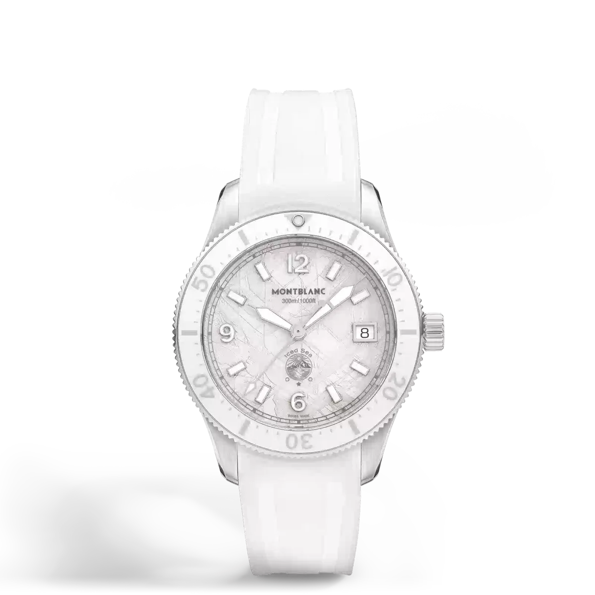 Il Montblanc Iced Sea Automatic Date 0 Oxygen con quadrante bianco con motivo ghiacciaio dà l’impressione di guardare nelle profondità di un ghiacciaio. Ispirata alla Mer de Glace, questa texture glaciale è stata ottenuta utilizzando una tecnica ancestrale quasi dimenticata chiamata gratté-boisé. L’orologio è racchiuso in una cassa in acciaio inossidabile da 38 mm totalmente priva di ossigeno ed è dotato di una lunetta girevole unidirezionale con inserto in ceramica bianca, un’incisione 3D sul fondello e un cinturino intercambiabile in caucciù bianco con sistema di regolazione fine. L’orologio è conforme alla norma ISO 6425 per le immersioni subacquee e ha un’impermeabilità di 300 metri. Numero di identificazione MB134025 Larghezza ansa 19 mm