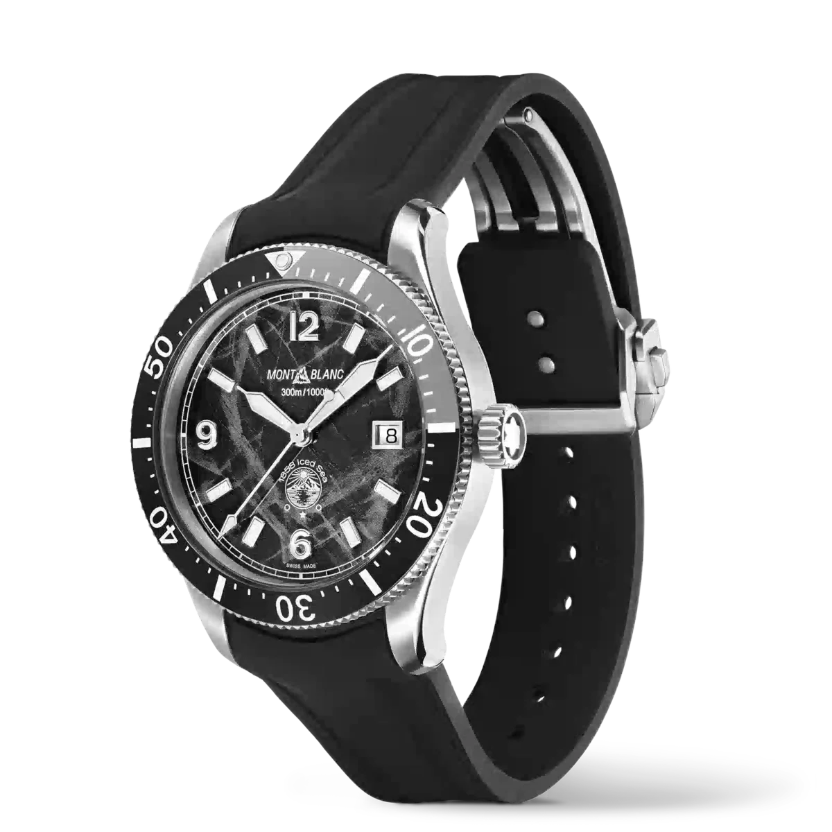 Primo orologio subacqueo sportivo di Montblanc, il Montblanc Iced Sea Automatic Date presenta un quadrante con motivo ghiacciaio che dà l’impressione di guardare nelle profondità di un ghiacciaio. Questo quadrante nero con motivo ghiacciaio si ispira alla Mer de Glace – Mare di Ghiaccio – il ghiacciaio principale del Massiccio del Monte Bianco. La sua texture è stata ottenuta utilizzando una tecnica ancestrale quasi dimenticata chiamata gratté-boisé. L’orologio è racchiuso in una cassa in acciaio inossidabile da 41 mm ed è dotato di una lunetta unidirezionale bicolore in ceramica, un fondello inciso e un cinturino intercambiabile in caucciù nero con sistema di regolazione fine. L’orologio è conforme alla norma ISO 6425 per gli orologi subacquei ed è impermeabile fino a 300 metri.