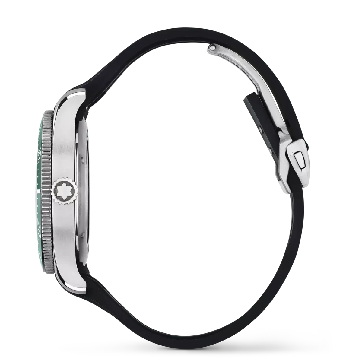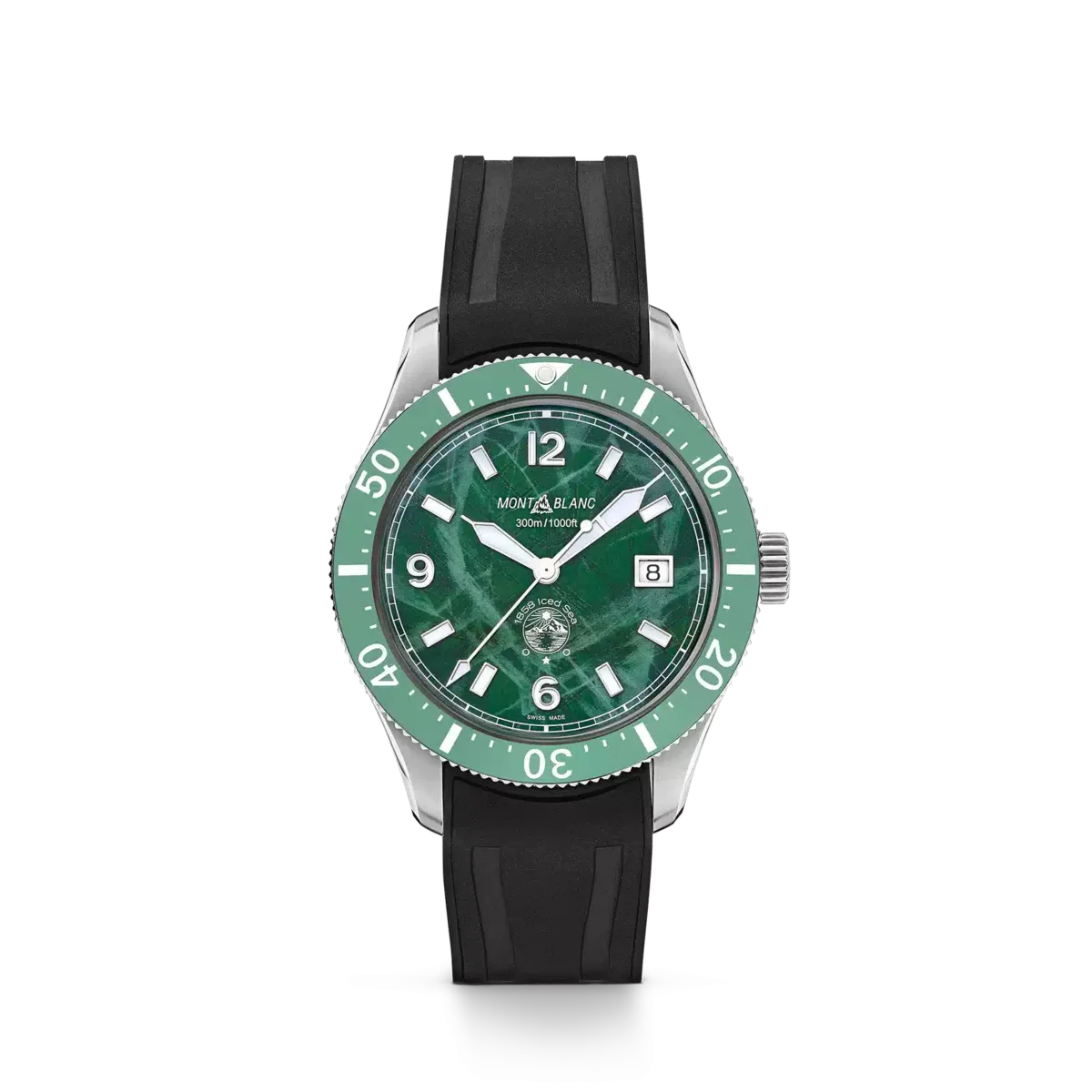 Primo orologio subacqueo sportivo di Montblanc, il Montblanc Iced Sea Automatic Date presenta un quadrante con motivo ghiacciaio che dà l’impressione di guardare nelle profondità di un ghiacciaio. Questo quadrante verde con motivo glaciale si ispira alla Mer de Glace, il mare di ghiaccio, il ghiacciaio principale del massiccio del Monte Bianco. La sua texture è stata ottenuta utilizzando una tecnica ancestrale quasi dimenticata chiamata gratté-boisé. L’orologio è racchiuso in una cassa in acciaio inossidabile da 41 mm ed è dotato di una lunetta unidirezionale bicolore in ceramica, un fondello inciso e un cinturino intercambiabile in caucciù nero con sistema di regolazione fine. L’orologio è conforme alla norma ISO 6425 per gli orologi subacquei ed è impermeabile fino a 300 metri. Numero di identificazione MB129765 Larghezza ansa 20 mm