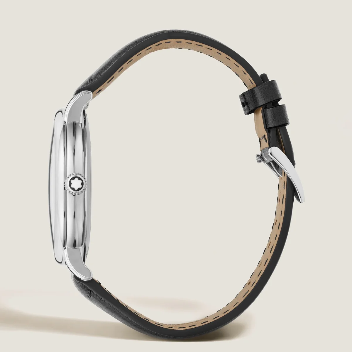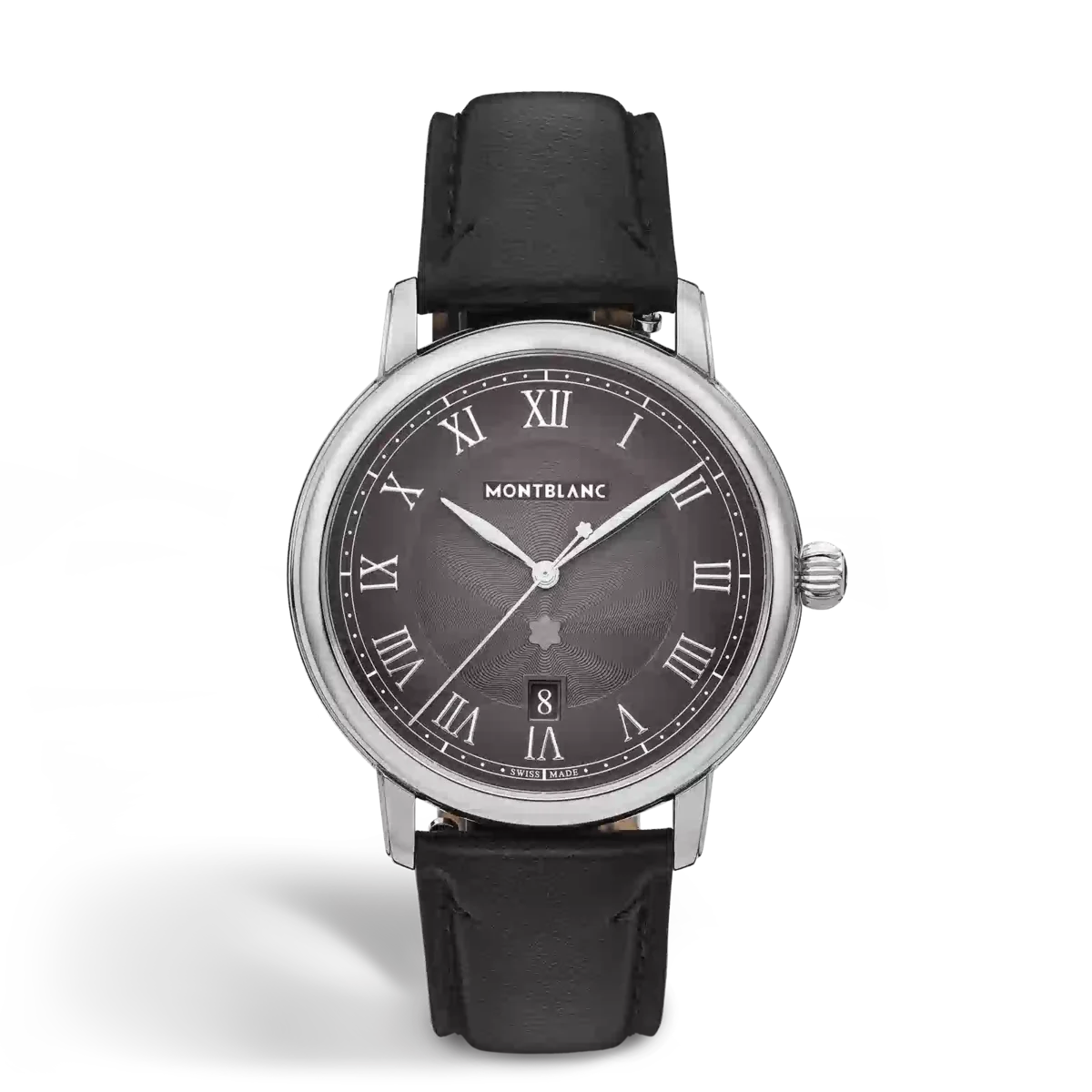 Il Montblanc Star Legacy Automatic Date porta i codici di design più raffinati della Maison a un nuovo livello di eleganza. L’orologio presenta un quadrante sfumato antracite con motivo guilloché a stella esplosiva, filet sauté, numeri romani rivestiti in rodio, lancette a forma di foglia e indica le ore, i minuti, i secondi e la data in modo semplice ed elegante. Questo modello è alimentato dal movimento automatico MB 24.17 ed è racchiuso in una cassa in acciaio inossidabile da 42 mm a forma di ciottolo, dotata di fondello aperto che offre una vista sulla massa oscillante decorata con l’emblema Montblanc. Il cinturino intercambiabile in pelle di vitello antracite è stato appositamente progettato dal direttore artistico di Montblanc Marco Tomasetta, che ha trovato ispirazione nei pennini degli strumenti di scrittura della Maison per la sua forma appuntita, impreziosita da un effetto sfumato verticale.