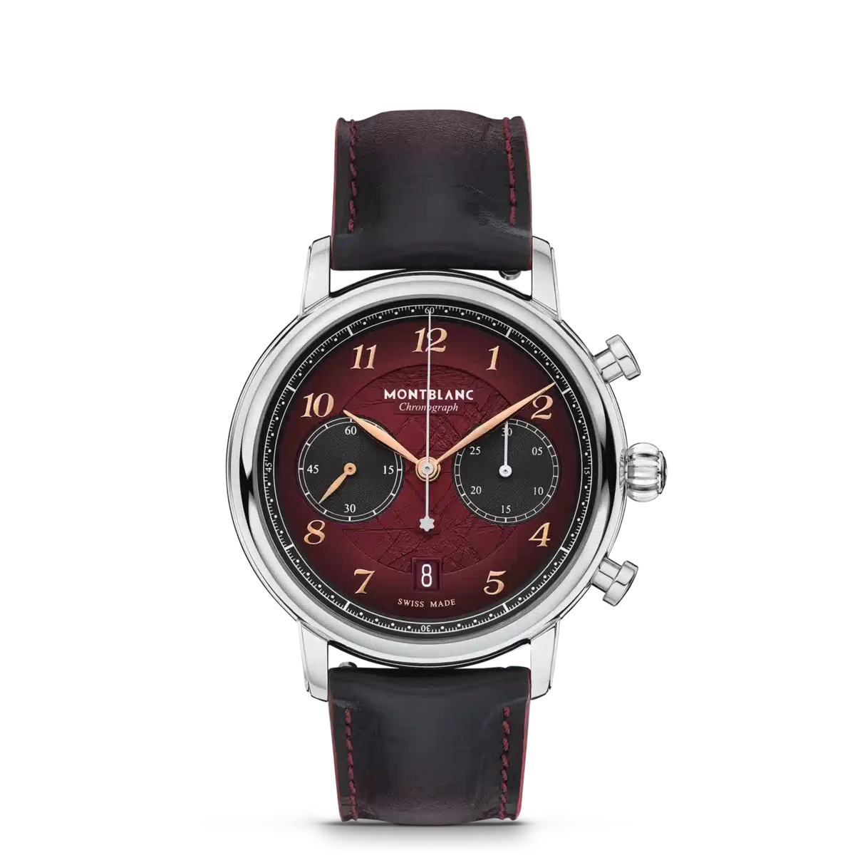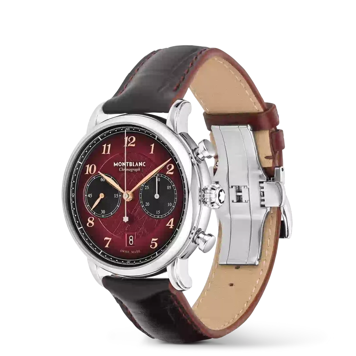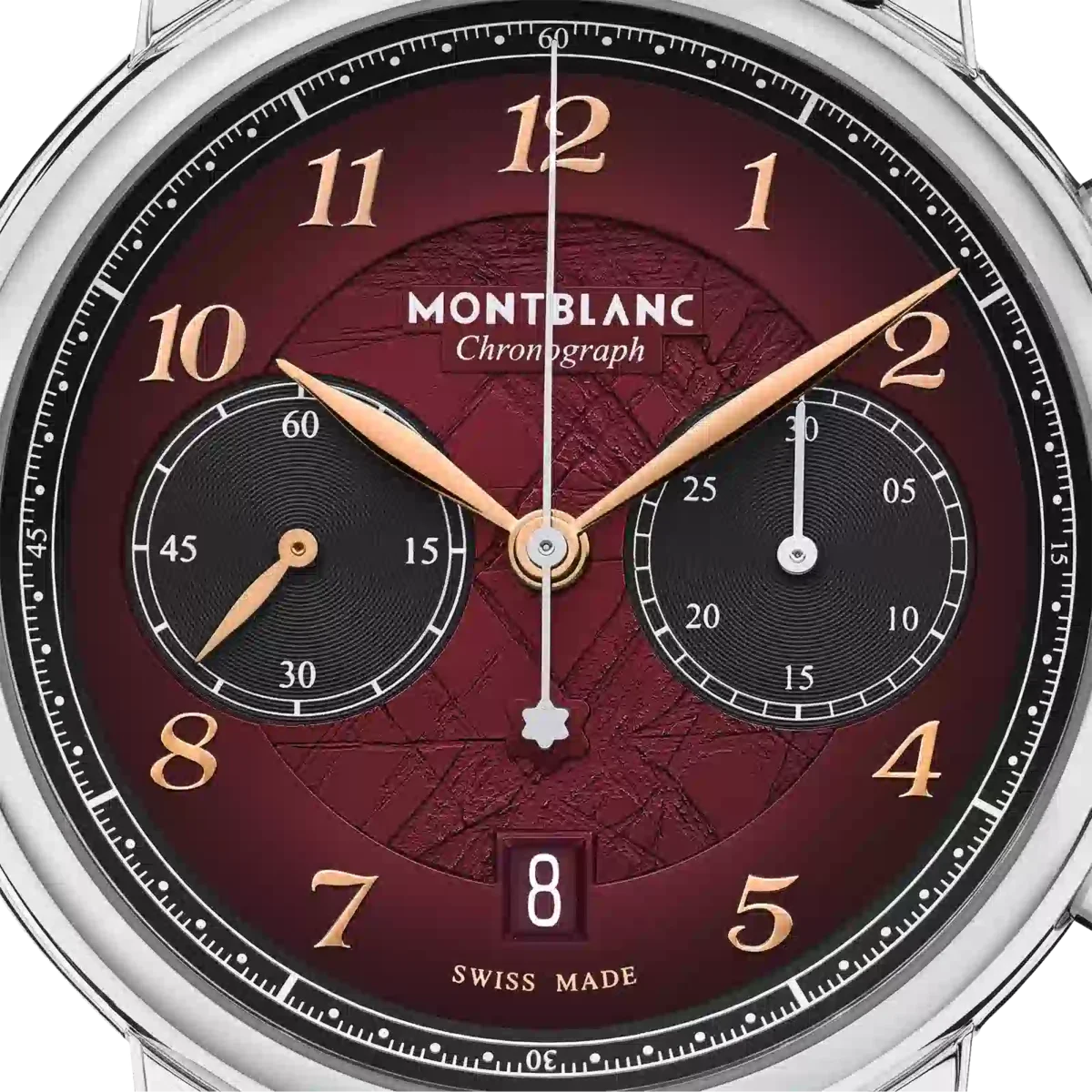 Il Montblanc Star Legacy Chronograph Limited Edition di 1786 pezzi rende omaggio all’intrepido Jacques Balmat, il primo a raggiungere la vetta del Monte Bianco nel 1786. L’orologio presenta un quadrante bordeaux con motivo ghiacciaio e effetto sfumato intorno al bordo esterno, minuteria a cremagliera e numeri rivestiti in oro rosa. Le indicazioni includono una lancetta dei secondi cronografica centrale con emblema Montblanc sul contrappeso e un contatore cronografico da 30 minuti con lancette placcate in rodio, mentre le funzioni di misurazione del tempo – ore, minuti e piccoli secondi – sono indicate da lancette placcate in oro rosa. Questo modello è alimentato dal movimento automatico MB 25.13 ed è racchiuso in una cassa in acciaio inossidabile da 42 mm con fondello aperto sul movimento. L’orologio è dotato di un cinturino intercambiabile in pelle di vitello con stampa alligatore e sfumato verticale.