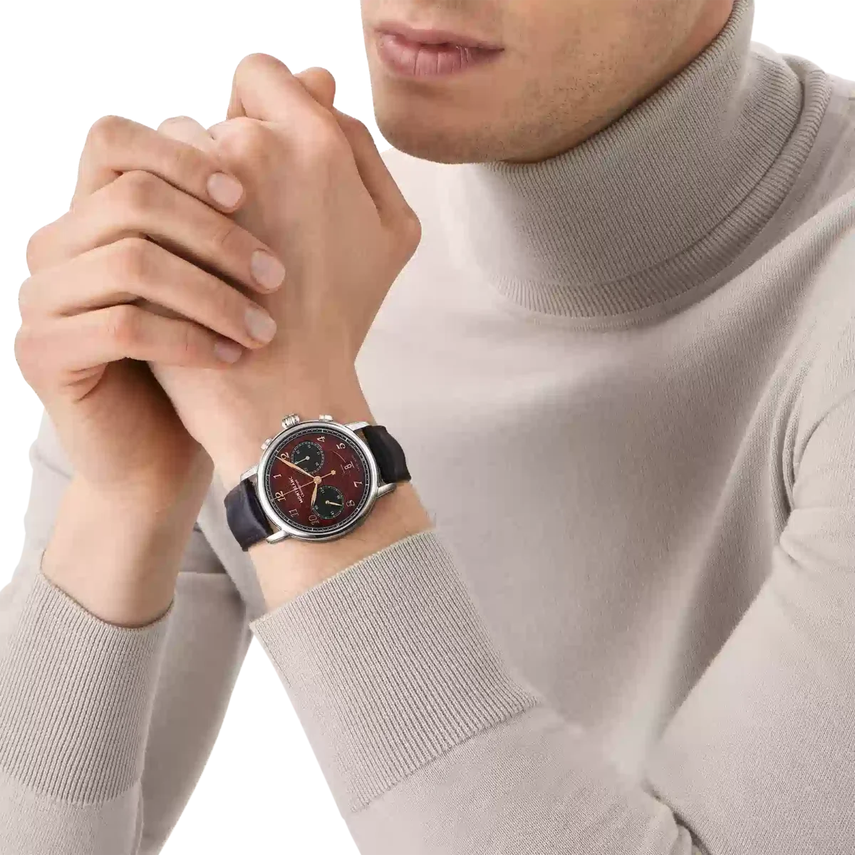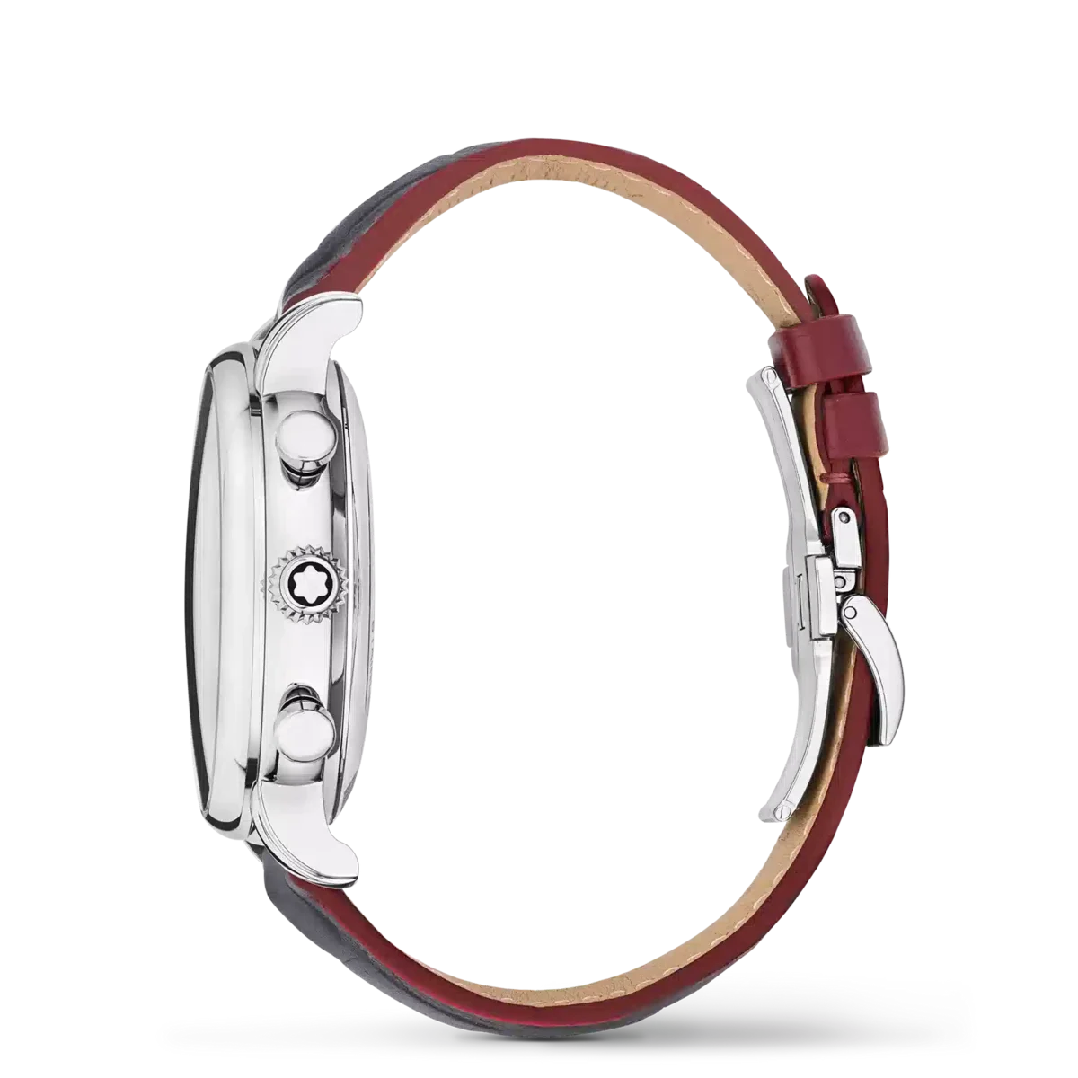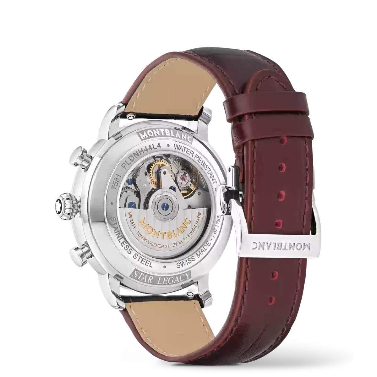 Il Montblanc Star Legacy Chronograph Limited Edition di 1786 pezzi rende omaggio all’intrepido Jacques Balmat, il primo a raggiungere la vetta del Monte Bianco nel 1786. L’orologio presenta un quadrante bordeaux con motivo ghiacciaio e effetto sfumato intorno al bordo esterno, minuteria a cremagliera e numeri rivestiti in oro rosa. Le indicazioni includono una lancetta dei secondi cronografica centrale con emblema Montblanc sul contrappeso e un contatore cronografico da 30 minuti con lancette placcate in rodio, mentre le funzioni di misurazione del tempo – ore, minuti e piccoli secondi – sono indicate da lancette placcate in oro rosa. Questo modello è alimentato dal movimento automatico MB 25.13 ed è racchiuso in una cassa in acciaio inossidabile da 42 mm con fondello aperto sul movimento. L’orologio è dotato di un cinturino intercambiabile in pelle di vitello con stampa alligatore e sfumato verticale.