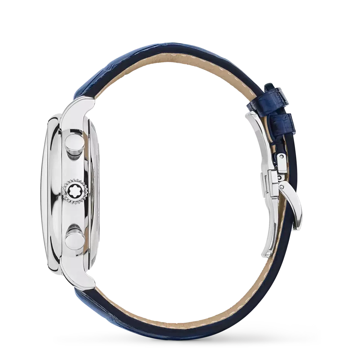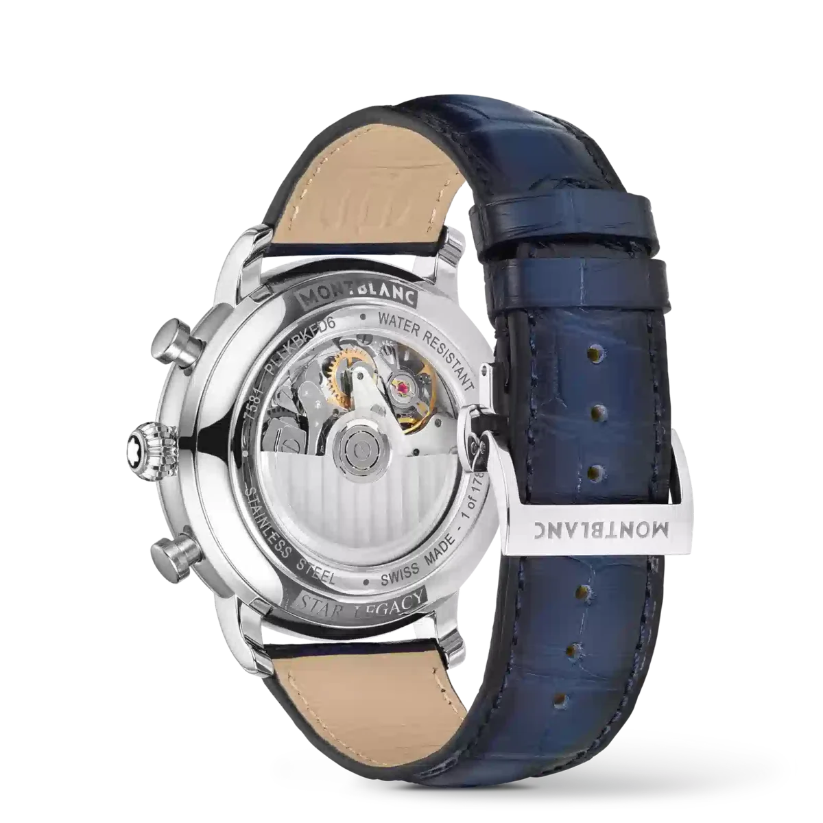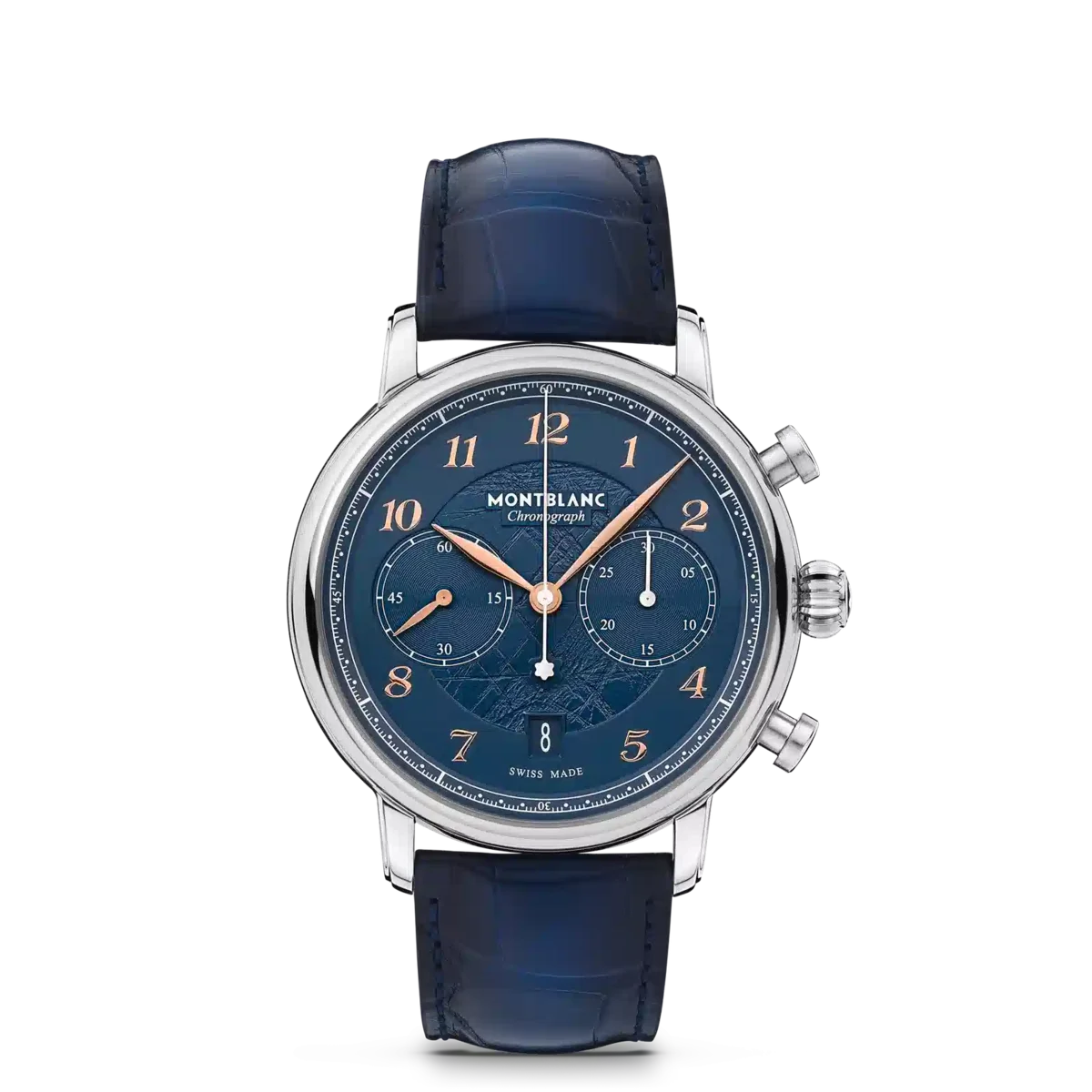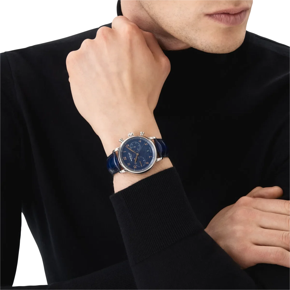 Il Montblanc Star Legacy Chronograph è limitato a 1786 esemplari ed è disponibile con cassa in acciaio inossidabile da 42 mm a forma di ciottolo con numeri arabi rivestiti in oro rosa e un accattivante quadrante blu con motivo ghiacciaio. Il quadrante è decorato con un motivo a strati di ghiaccio ispirato alla Mer de Glace, il ghiacciaio principale del Monte Bianco. Il centro del quadrante è realizzato con uno speciale stampo che riproduce la texture del ghiacciaio e celebra l'”ora blu” – “l’heure bleue”, durante la quale una tonalità di blu intenso ricopre il ghiacciaio al tramonto, quando la luna sorge e le stelle iniziano a brillare. Fu proprio in questo momento della giornata che Jacques Balmat divenne la prima persona a raggiungere la vetta del Monte Bianco, alle 18:23 del 7 agosto 1786. Le funzioni includono ore, minuti, secondi centrali con l’emblema Montblanc sul contrappeso, cronografo e data, alimentate dal movimento automatico MB 25.13 che può essere ammirato attraverso il fondello in vetro zaffiro. Le funzioni dell’ora sono indicate da lancette a foglia placcate in oro rosa, mentre le indicazioni del cronografo utilizzano lancette “a bastone” placcate in rodio. L’orologio è abbinato a un cinturino in alligatore blu sfumato.