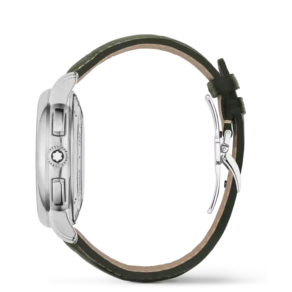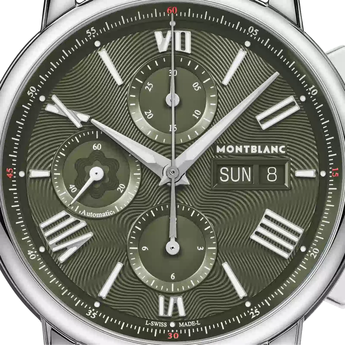 Il Montblanc Star Legacy Chronograph Day & Date Limited Edition di 800 pezzi si ispira agli orologi da tasca Minerva della fine del XIX e dell’inizio del XX secolo, con le loro casse rotonde, lucide, a forma di ciottolo e le corone a forma di cipolla. Il suo splendido quadrante verde presenta il caratteristico motivo a stella esplosiva di Montblanc, insieme a lancette e numeri a forma di spada rivestiti in rodio. È alimentato dal movimento automatico MB 25.07 che include un cronografo, il giorno della settimana e la data. Questo orologio è inoltre dotato di un cinturino intercambiabile in pelle di vitello verde con stampa alligatore e cuciture écru.