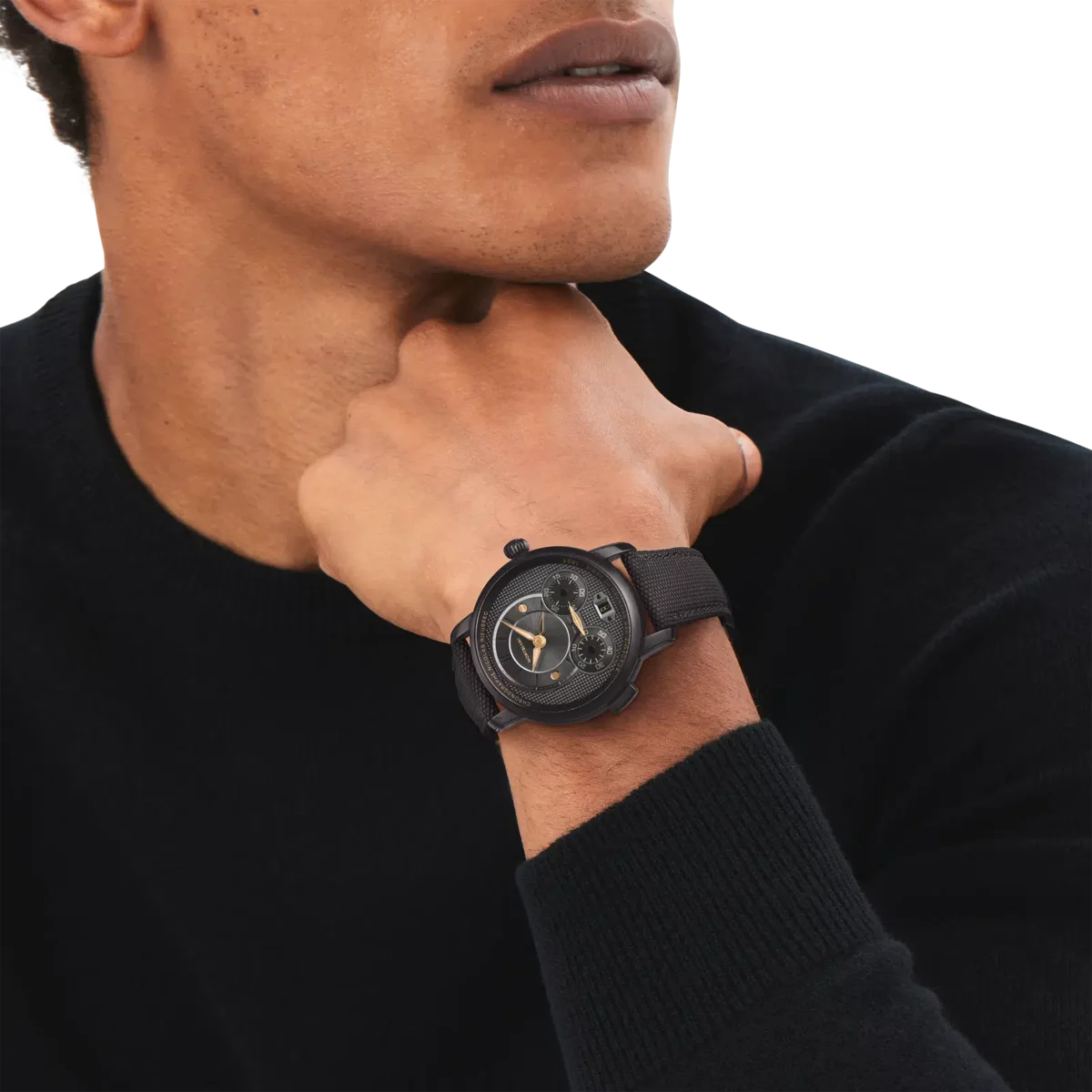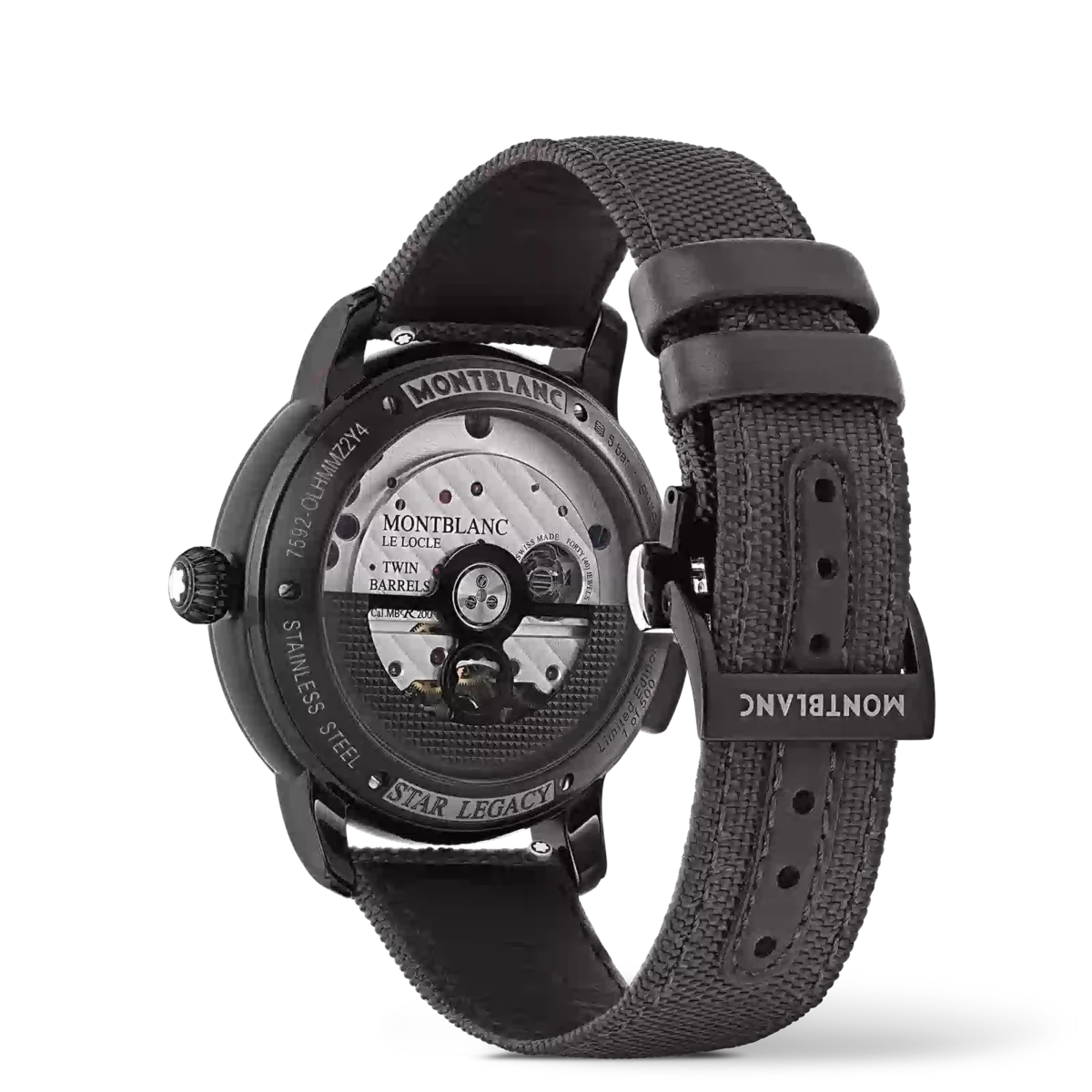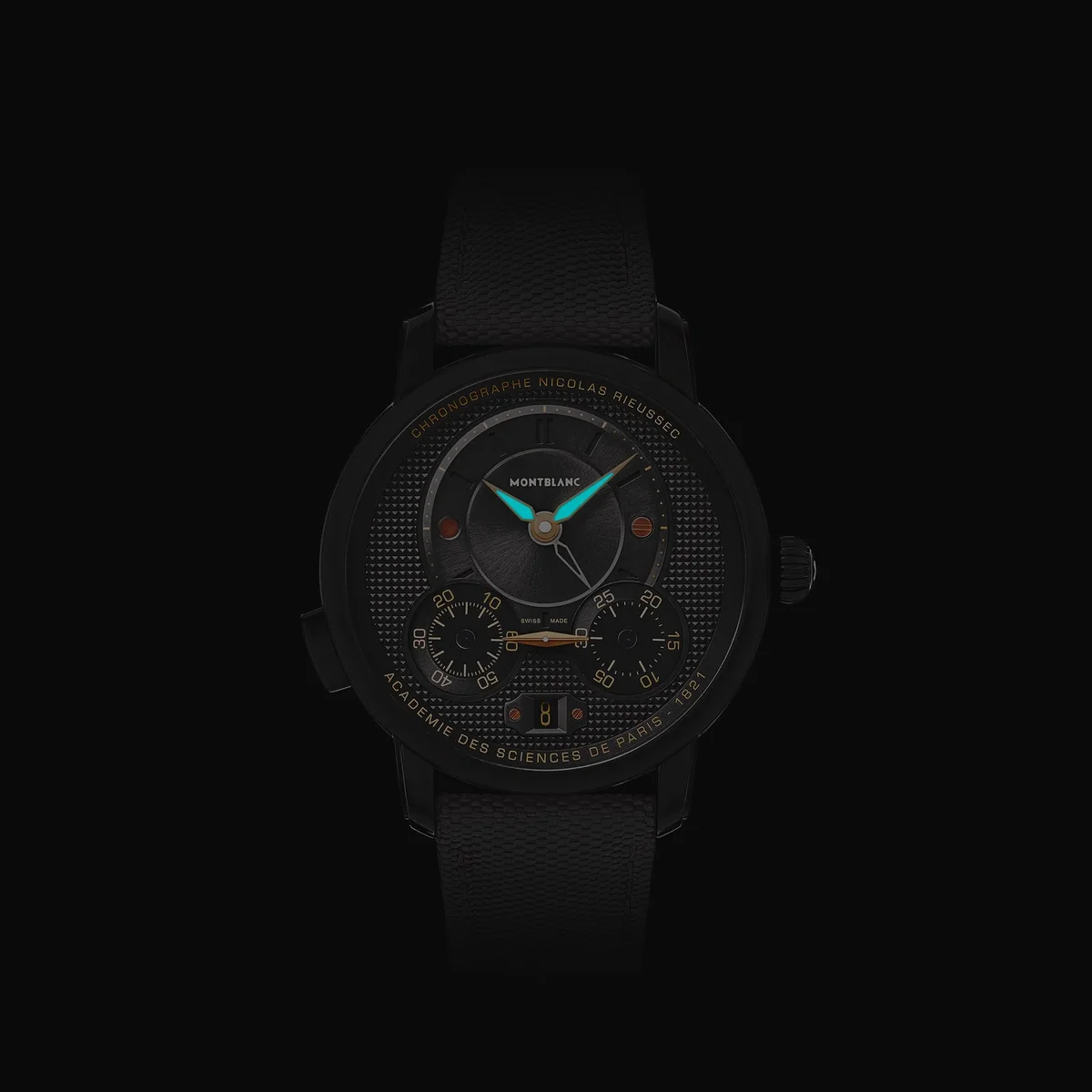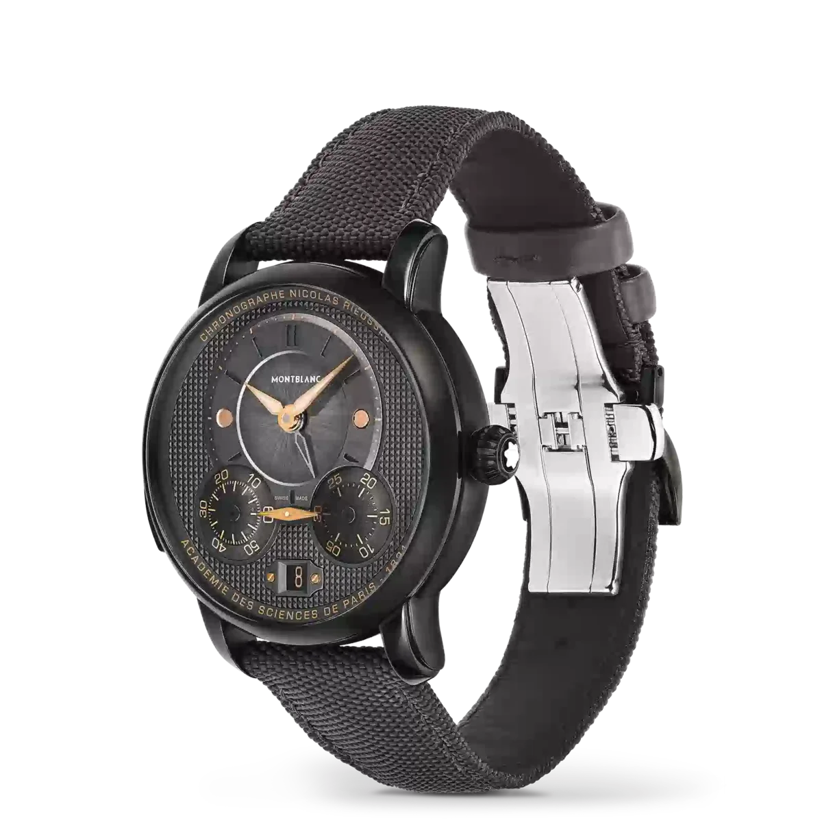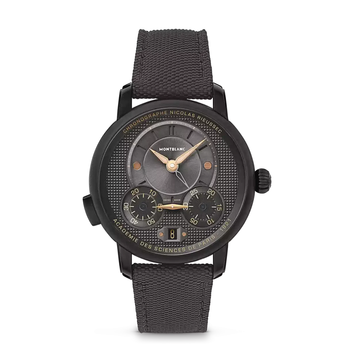 Il Montblanc Star Legacy Nicolas Rieussec Monopusher Chronograph Limited Edition di 500 pezzi è alimentato dal movimento di manifattura MB R200 ed è disponibile in una cassa in acciaio inossidabile da 43 mm con rivestimento DLC nero, quadrante color antracite, lancette rivestite in oro rosa e indici neri. Questo nuovo modello presenta diversi dettagli che rafforzano il legame storico con Parigi, dove la storia dei cronografi Montblanc ha avuto inizio all’ippodromo Champ-de-Mars, tra cui il motivo Clou de Paris sul quadrante che si ripete sulla massa oscillante e sul cinturino in tessuto. Questo motivo trae origine dal disegno geometrico delle strade acciottolate di Parigi e rappresenta il legame tra il passato e il futuro di questo segnatempo.