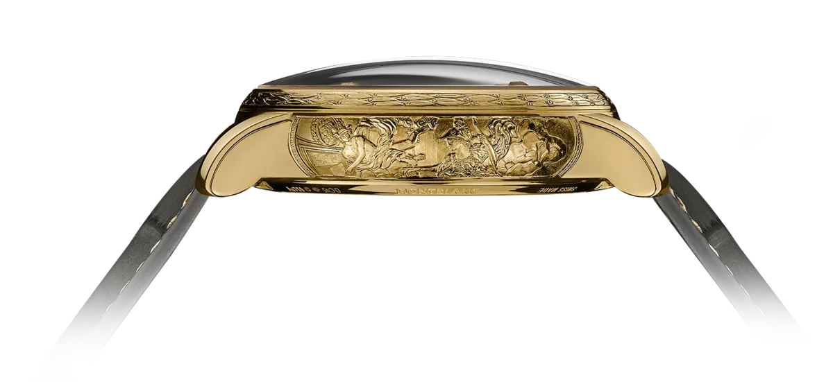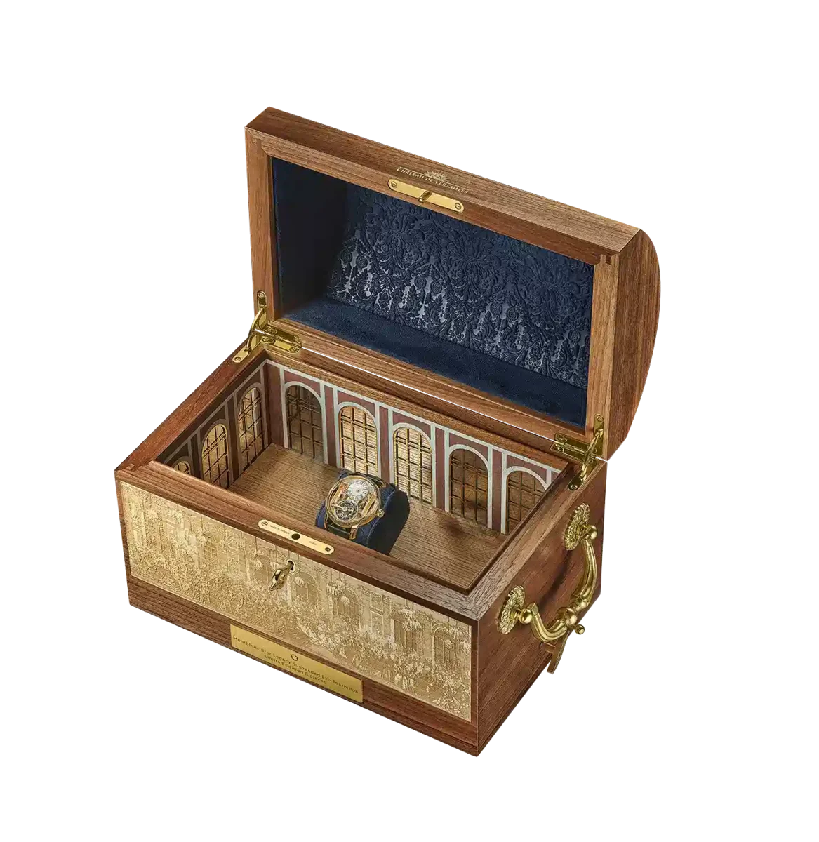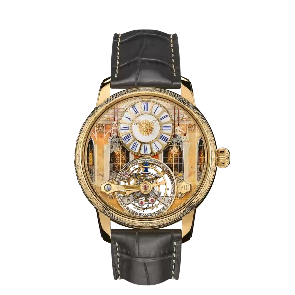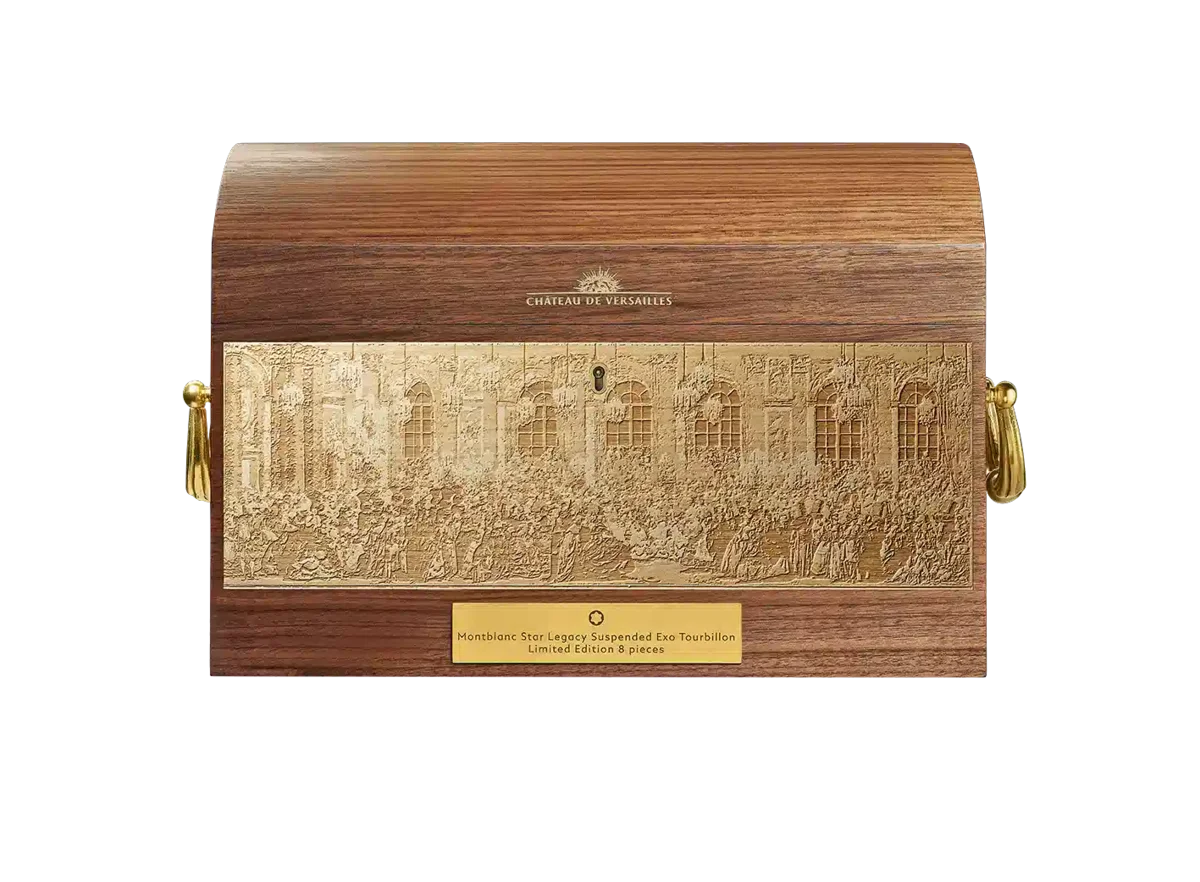 Ricrea il grandioso ballo in maschera organizzato nel 1745 da Luigi XV nella famosa Sala degli Specchi di Versailles con il Montblanc Star Legacy Suspended Exo Tourbillon Château de Versailles: “Le Secret du Bal des Ifs”. Questo eccezionale segnatempo combina la tradizionale alta orologeria, l’intarsio, l’incisione a mano e lo smalto champlevé con la modellazione digitale 3D e l’incisione laser. Il quadrante principale ricrea il famoso “Ball delle If”, con una base in oro bianco 750/1000 (18 carati) ricoperta di smalto nero e paillons d’oro, che evocano i riflessi dei lampadari illuminati dalle candele alle finestre della Sala degli Specchi. Gli archi sono realizzati in pietra Cacholong e marmo Sarrancolin, provenienti dalla stessa cava nella regione francese degli Hautes-Pyrénées utilizzata a Versailles. Il pavimento in parquet è riprodotto fedelmente in rovere massello. I lampadari e gli ospiti in costume sono incisi su una lastra di zaffiro sovrapposta al quadrante principale. Ispirato agli orologi dell’epoca di Luigi XIV, il quadrante situato a ore 12 richiama le tradizioni dell’Alta Orologeria utilizzando smalto champlevé e un anello inciso in oro giallo 750/1000 (18 carati), mentre le lancette scheletrate in oro giallo 750/1000 (18 carati) sono sormontate dalla testa di Apollo. La cassa in oro giallo 750/1000 (18 carati) è impreziosita da una corona di alloro incisa a mano sulla lunetta e da una scena raffigurante Minerva e Mercurio sul carrure che ricrea un dipinto del Salon de la Paix, una sala situata accanto alla Sala degli Specchi. Questo segnatempo è animato dal calibro di manifattura MB M16.68 con la complicazione brevettata Suspended Exo Tourbillon, che ha richiesto tre anni di sviluppo. Il cinturino intercambiabile in pelle di vitello grigio con stampa alligatore e la fibbia tripla pieghevole in oro giallo 750/1000 (18 carati) completano questo eccezionale segnatempo. Limitato a 8 esemplari, il Montblanc Star Legacy Exo Tourbillon Château de Versailles: “Le Secret du Bal des Ifs” è presentato in un cofanetto in noce contenente un carillon che riproduce un brano tratto da una commedia-balletto di Jean-Philippe Rameau. Uno spettacolo incantevole su un pavimento in parquet in miniatura circondato da archi in marmo, che evoca il ballo in maschera di Versailles nella Sala degli Specchi.