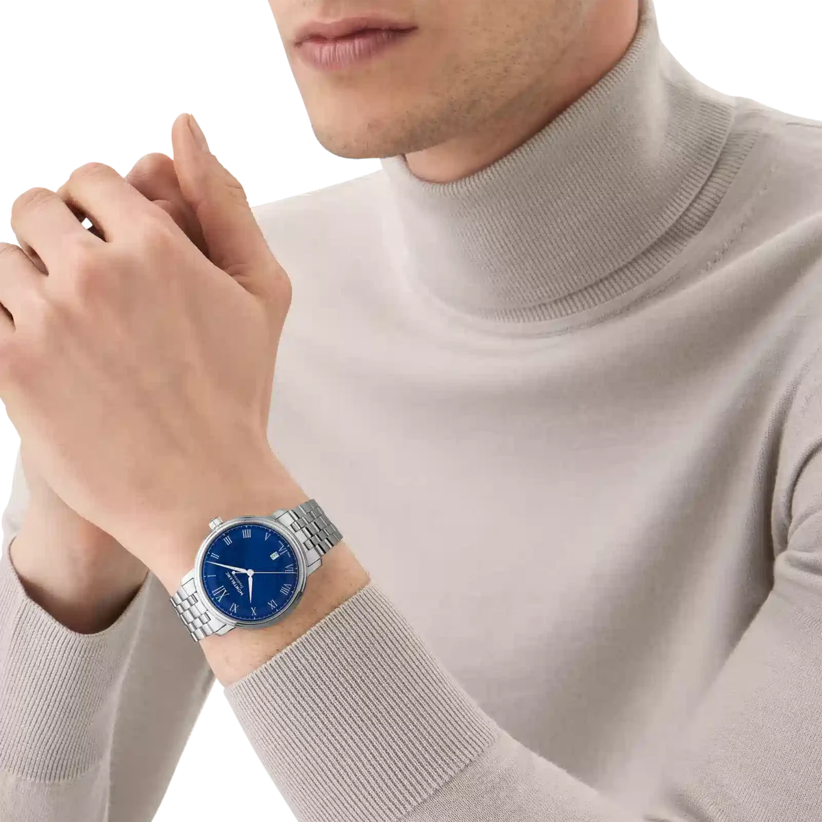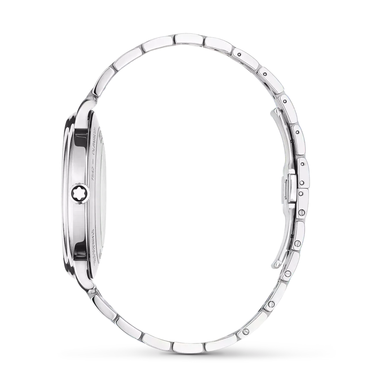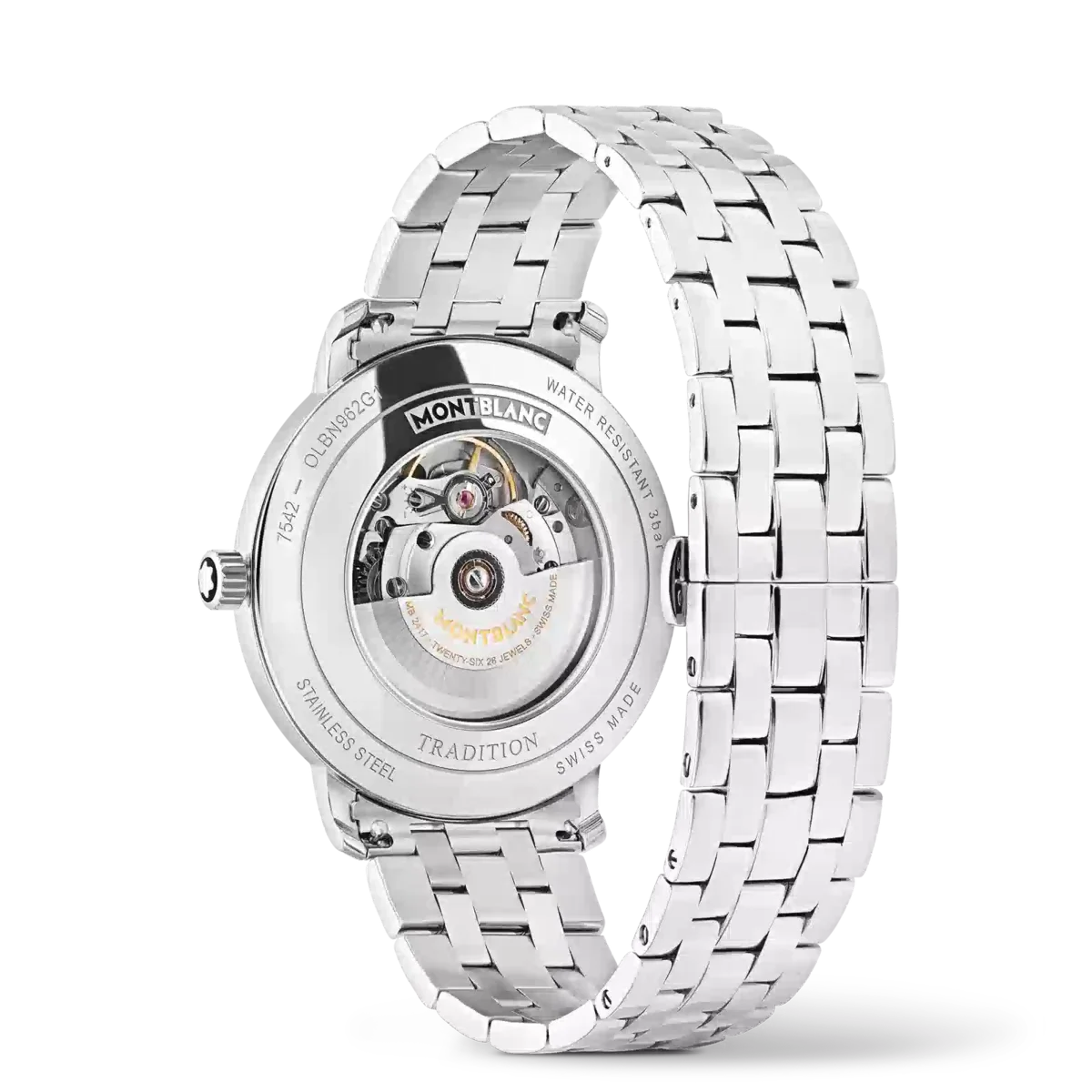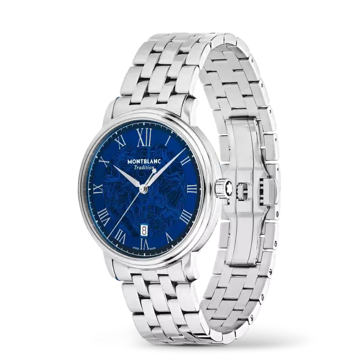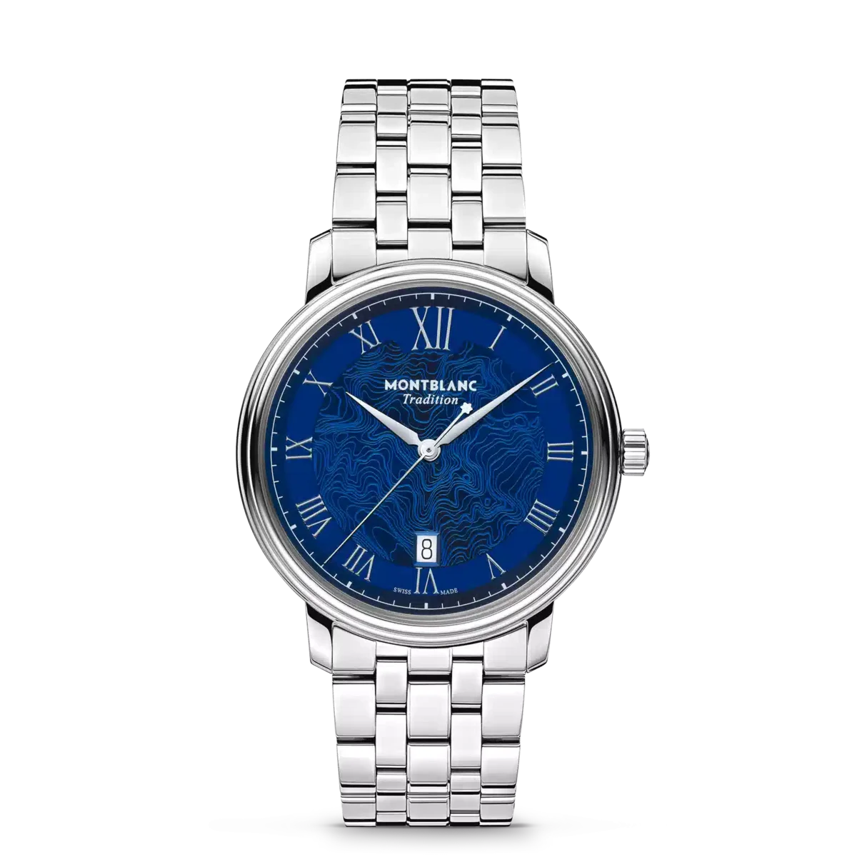 Il Montblanc Tradition Automatic Date è disponibile con cassa in acciaio inossidabile da 40 mm con anse dritte e lunetta a doppia forma. L’orologio presenta un quadrante blu che raffigura la topografia del Monte Bianco con numeri romani color argento e un prominente “XII” romano. Le lancette delle ore e dei minuti a forma di spada, la lancetta dei secondi e la corona con l’emblema Montblanc e il bracciale intercambiabile in acciaio inossidabile completano il suo aspetto elegante e contemporaneo.